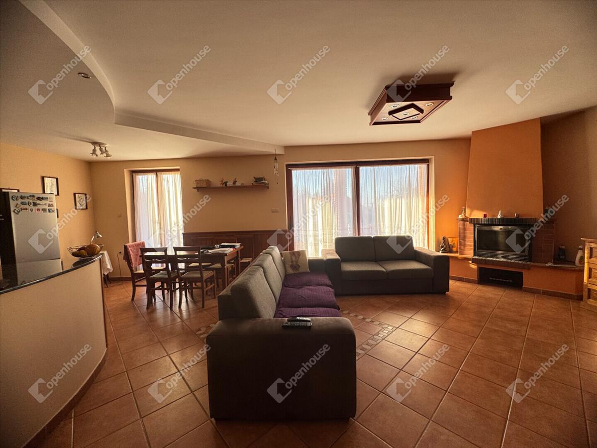 A nappali központi eleme a hangulatos, tűzteres kandalló, amely nemcsak esztétikai élményt nyújt, hanem igazi otthonérzetet teremt a hűvösebb estéken.