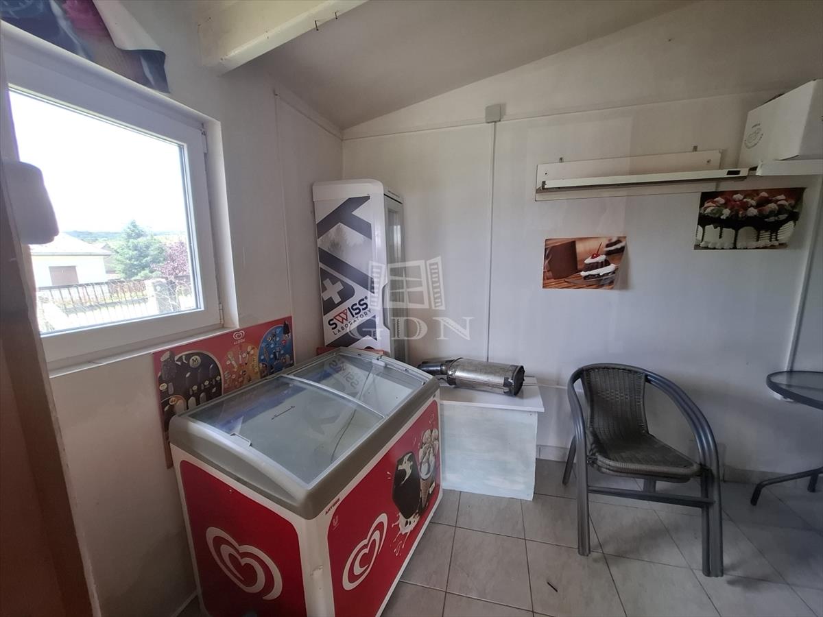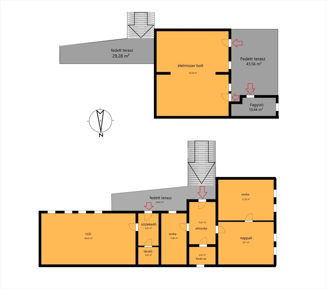 Az alsó szinten bolt (mely jelenlegi is üzemel), fagyizó és egy fedett terasz van. Az ingatlan így vállalkozásra is tökéltetesen megfelelő.