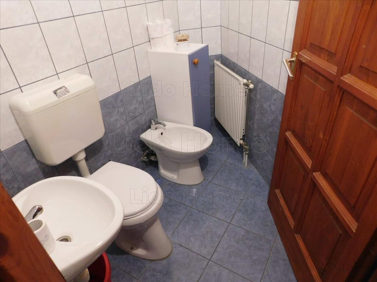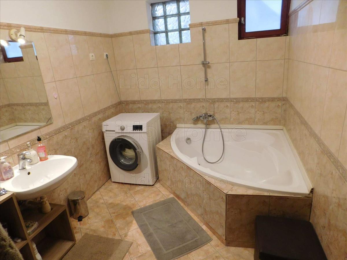 -az alsó szinten található még egy kádas fürdőszoba, háztartási helyiség, ahol található a gázkazán, meleg vízszolgáltatásra bojler. a bejárattal szemben 1 szoba zárja az alsó szintet. a nappaliban a kellemesebb hőmérséklet érzést 1 db fa tüzelésű kandalló is segíti.