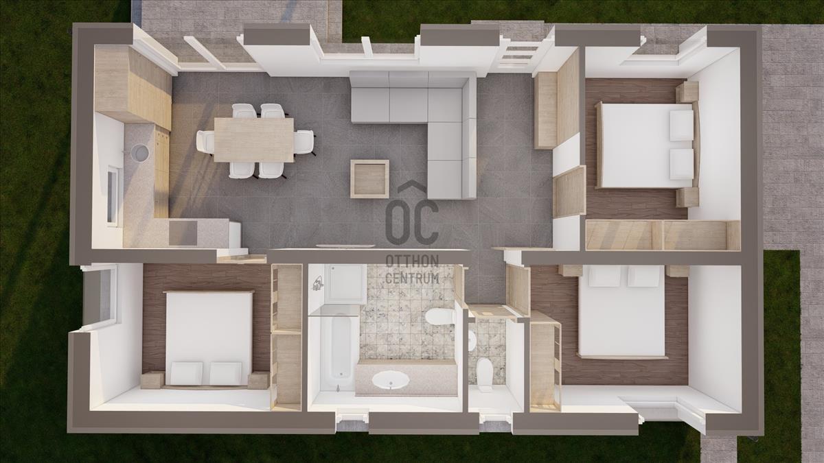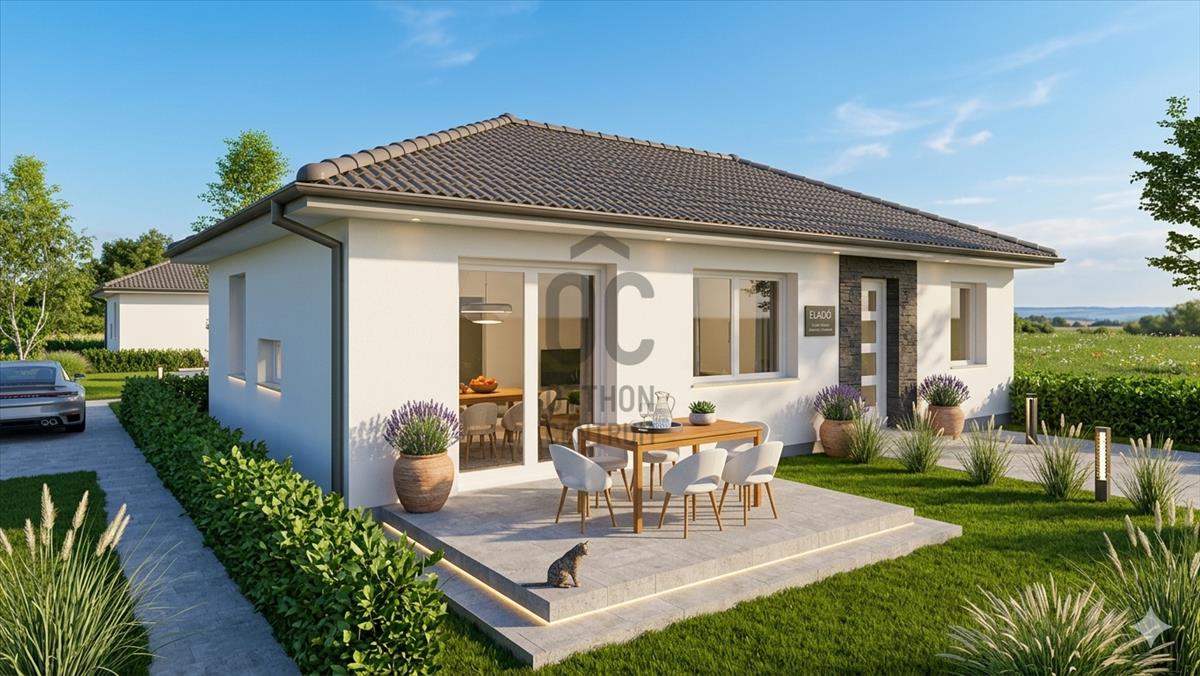 A ház belső elrendezése rendkívül praktikus: amerikai konyhás nappali+ 3 szobával szobával rendelkezik. a tágas nappali világos és barátságos, ideális helyszín a közös családi programokhoz. a fürdőszoba egyaránt kényelmes és elegáns, a prémium kivitelezés pedig garantálja, hogy az ingatlan állapota kiváló legyen. a fürdőszobában tusoló és fürdőkád is rendelkezésre áll. a 10 négyzetméteres teraszra kilépve élvezheted a szabadban töltött időt.