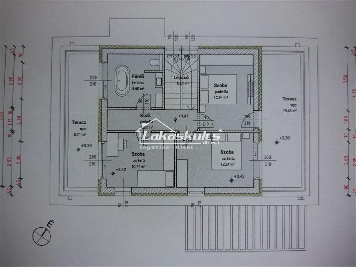 Emeleti részen három szobánként klimatizált hálószoba (10, 77 nm-12, 24 nm-12, 04 nm) és egy fürdőszoba található, nyugati és keleti fekvésű terasz kialakításokkal (8, 71 nm-15, 48 nm).