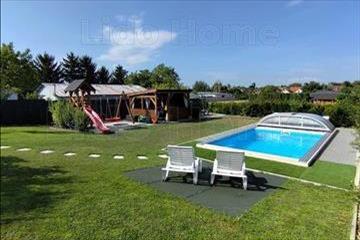 Gyönyörű örökzöldek ölélésében, 971 m2 gondozott kertben felépült 144 m2 lakótérrel rendelkező kétszintes ház. Fedett teraszról lépünk be a földszinti lakrészbe ahol 4 fő befogadására alkalmas amerikai konyhás nappali, hálószoba, fürdőszoba szolgálja a kényelmet. a fenti lakrész a ház hátsó részéből közelíthető meg egy kisebb fedett teraszról, zárt lépcsőházon át. "Természetes" hangulat fogad a fa gerendás tetőtérben, ahol 4 fő kényelmére amerikai konyhás nappali, hálószoba, fürdőszoba és gardrób került kialakításra.