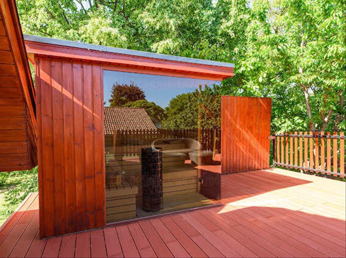 -kényelmes, tágas terek, a nagy ház bejáratánál terasz, illetve a kis ház mellett egy magasított napozó terasz szaunával