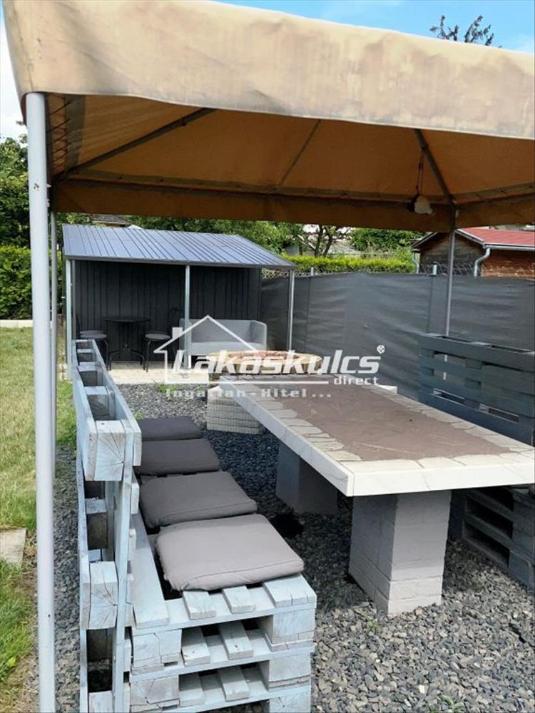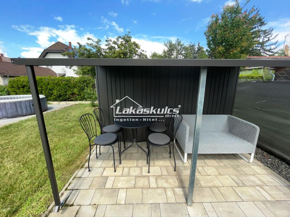 A kert rendezett, játszótérrel, grillezési lehetőséggel, pihenősarkokkal és 2 Biohort tárolóval (15 nm). Kiváló családi háznak, üdülőnek, befektetésnek.
