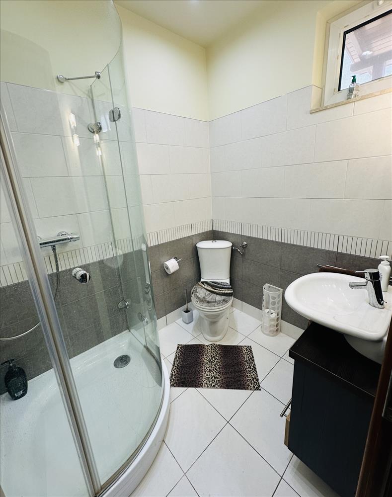 A bejárat mellett található egy zuhanyzós fürdőszoba, valamint a garázs és gépészeti helyiség, amelyek a konyhából is megközelíthetők.