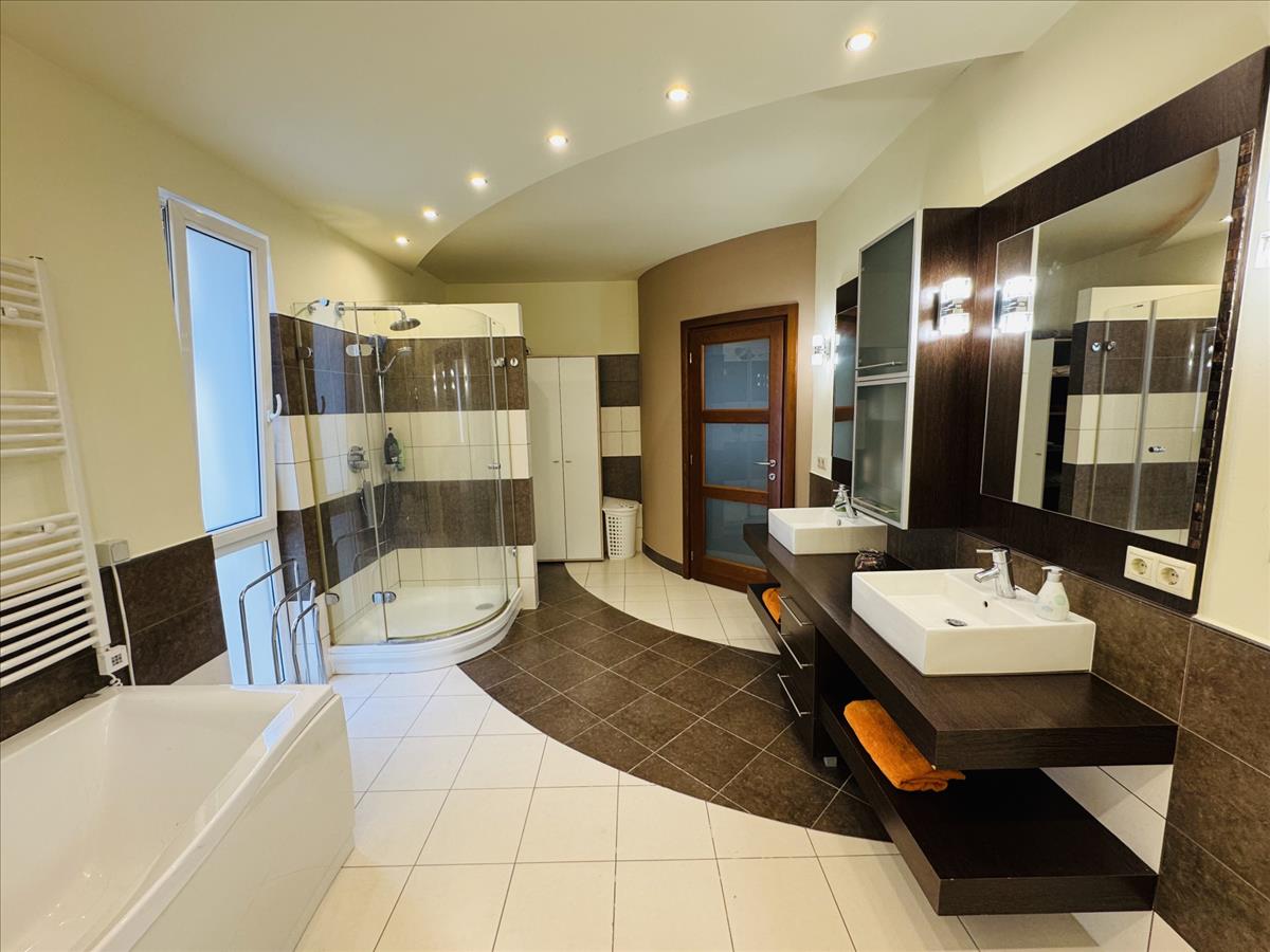 Az emeleten három hálószoba, egy nagy méretű (13 m²-es) fürdőszoba, külön wc és mosóhelyiség, valamint egy kis dolgozószoba található.