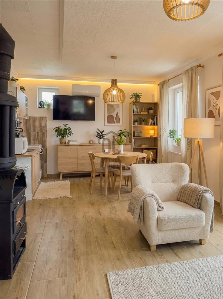 Fűtés/hűtés: hűtő-fűtő klíma (3, 5 kW), elektromos fűtőpanel és kandalló