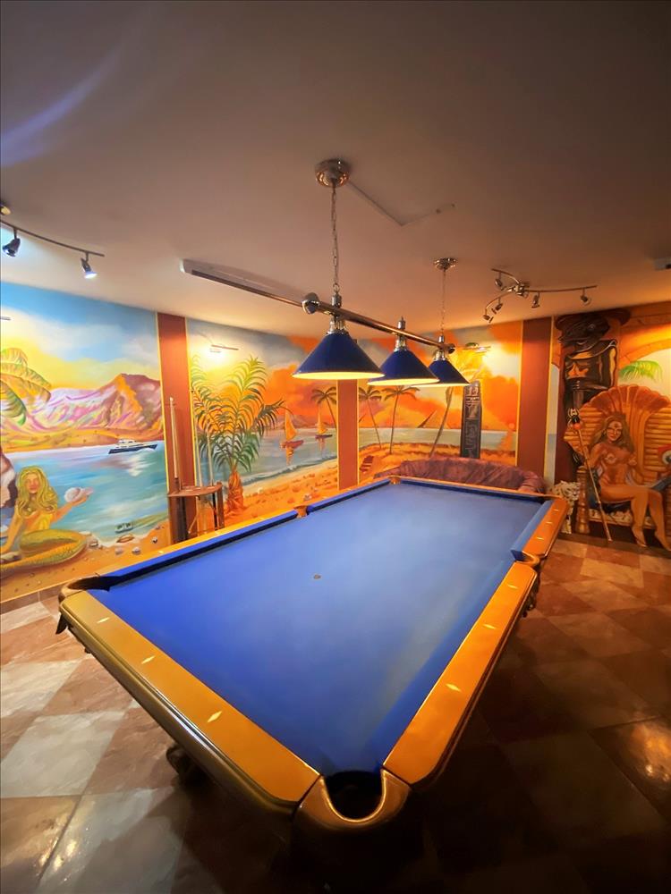 Az alagsorban konditerem, mosókonyha, kamra, gépház, 1 szoba és játékterem billiárdasztallal,