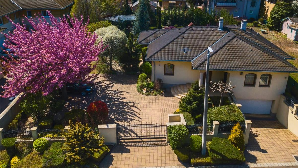 Egyedi készítésü kovácsoltvas automata kapun át jutunk be az impozáns gondozott udvarba,