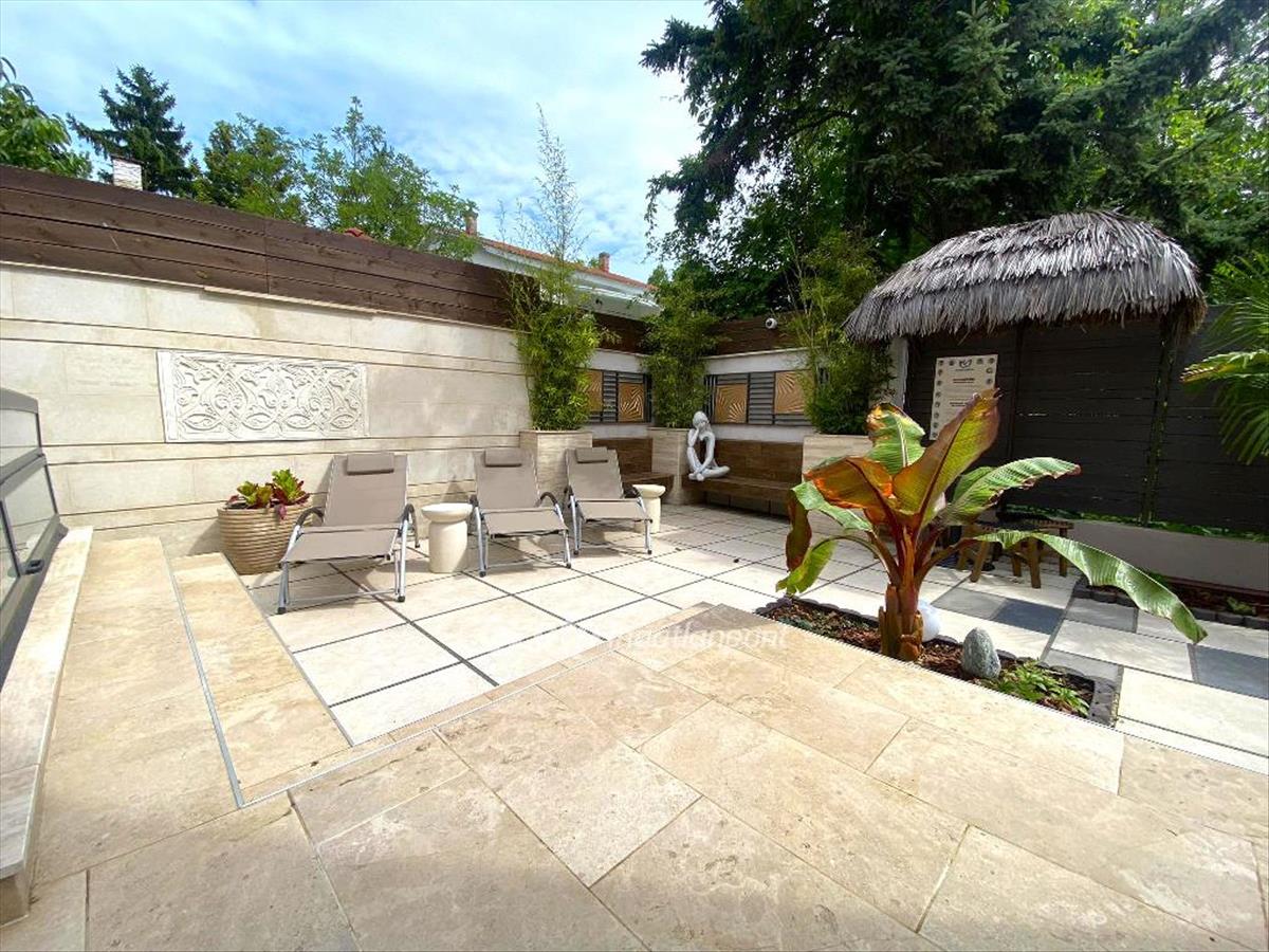 Az udvarban fűthető, fedett medence, valamint fedett jakuzzi, a medencetérhez kapcsolódó földszinti épületrészben pedig infra-, finn szauna található.