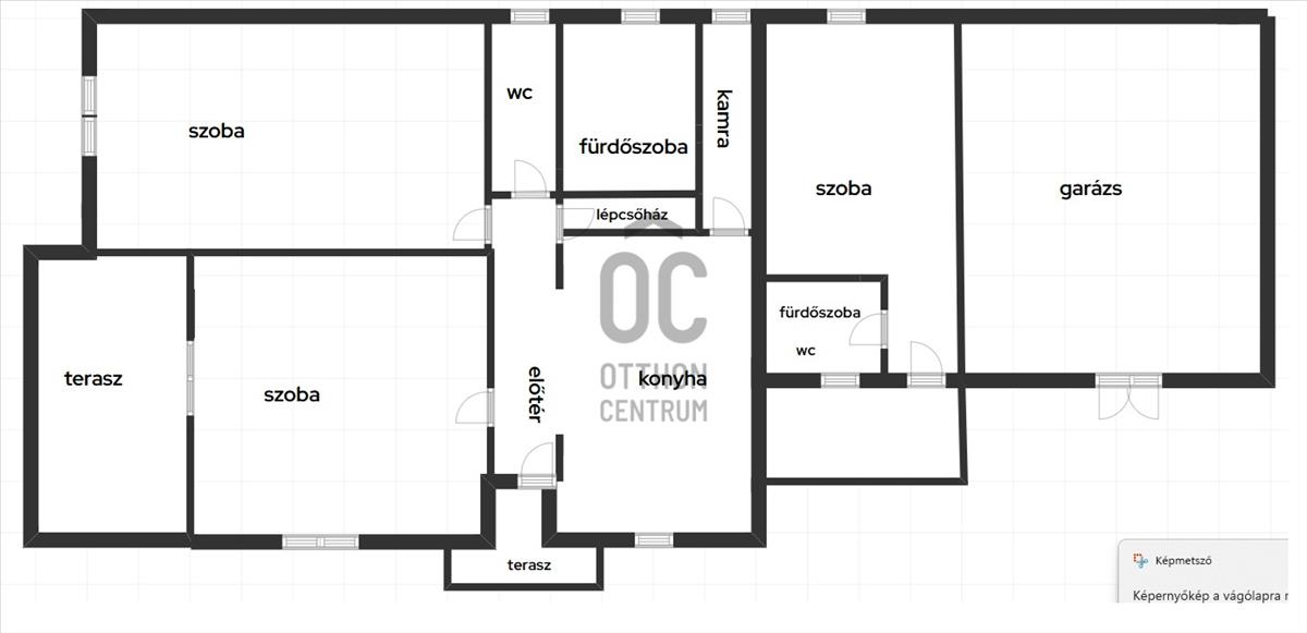 Helyiségei: 2 tágas, világos szoba, konyha, kamra, előtér, wc, fürdőszoba, lépcsőház, egy nagyobb, és egy kisebb terasz.