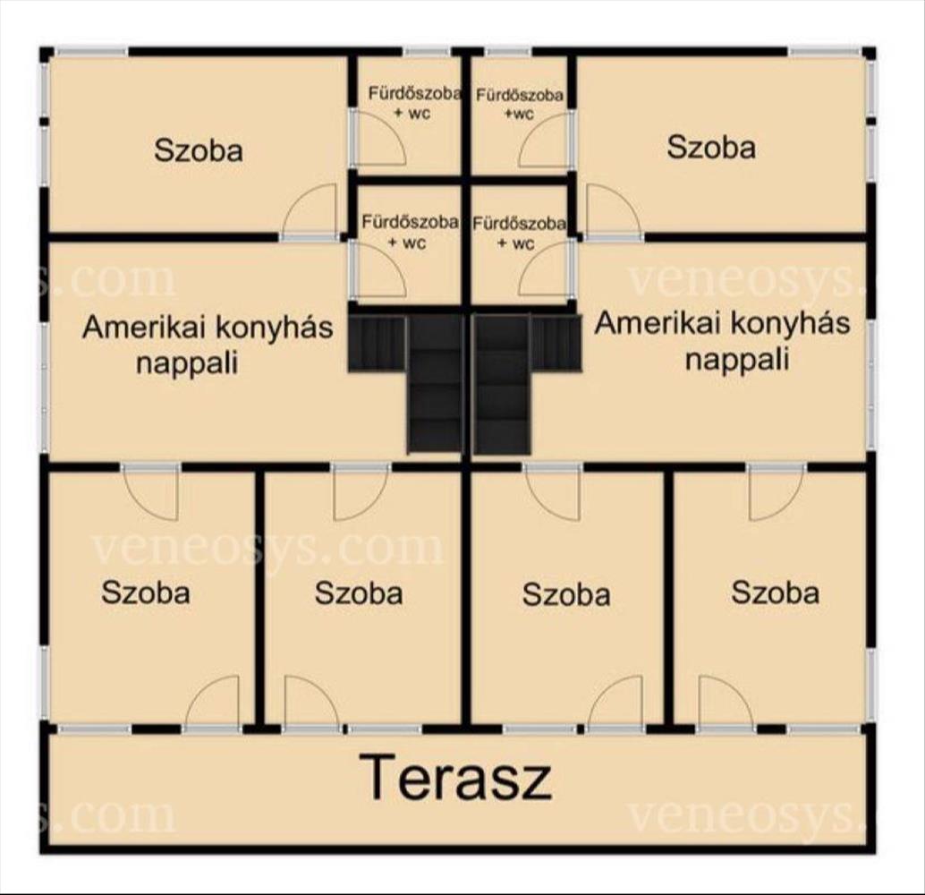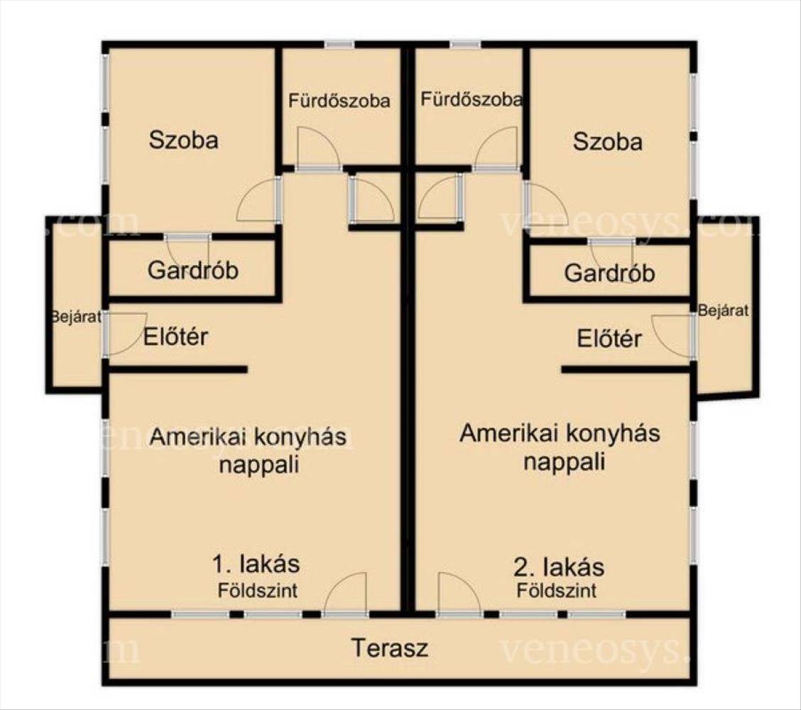 A alsó szinten lakásonként egy hatalmas amerikai konyhás nappali, egy hálószoba + gardrób, külön wc, fürdőszoba+wc, előszoba és egy terasz kapott helyet. a felső szinten lakásonként egy amerikai konyhás nappali, 3 hálószoba, 2 fürdőszoba+wc és terasz kialakítású.