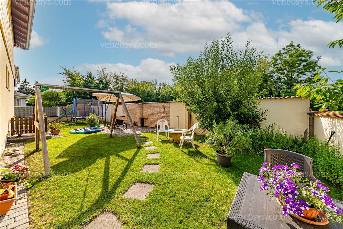 A kert hátsó felén található egy intim füves terület. Itt található egy kisebb játszótér, bográcsozó hely, és egy napozó rész. a kert méretéből adódóan alkalmas lehet medence építésére is.