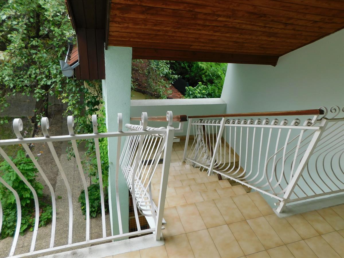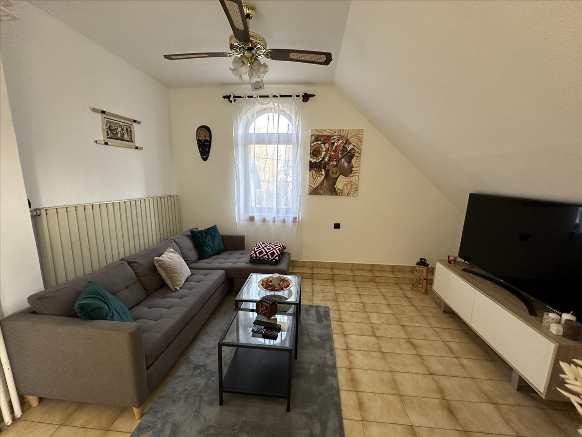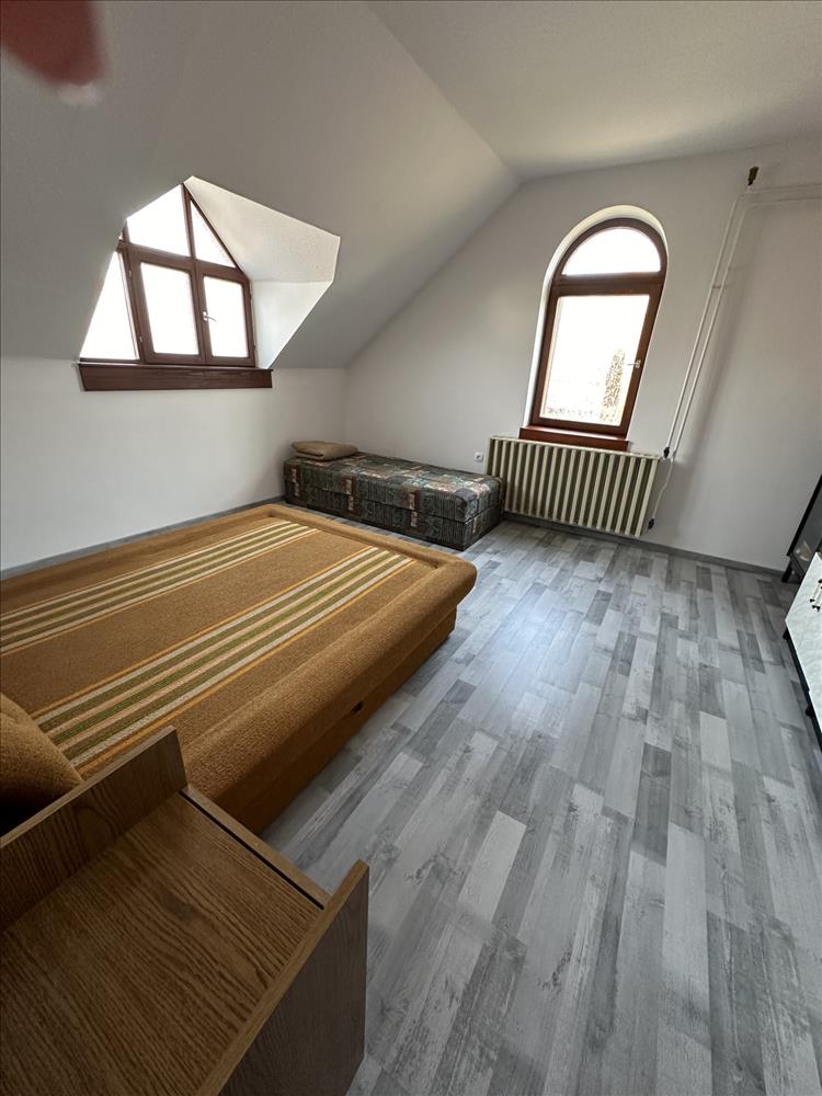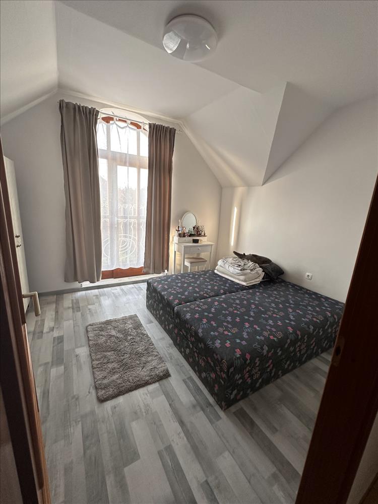 Az emeleti lakrész külön, külső fedett lépcsőházon keresztül közelíthető meg. Ezen a szinten idén részleges felújítás történt: a szobák laminált parkettát kaptak, új konyhabútor került beépítésre, valamint az ingatlant kifestették. Az emeleten 3 szoba, 2 fürdőszoba, főzőfülke és egy tágas nappali-étkező található, ahonnan egy kb. 10 M²-es fedett teraszra léphetünk ki.