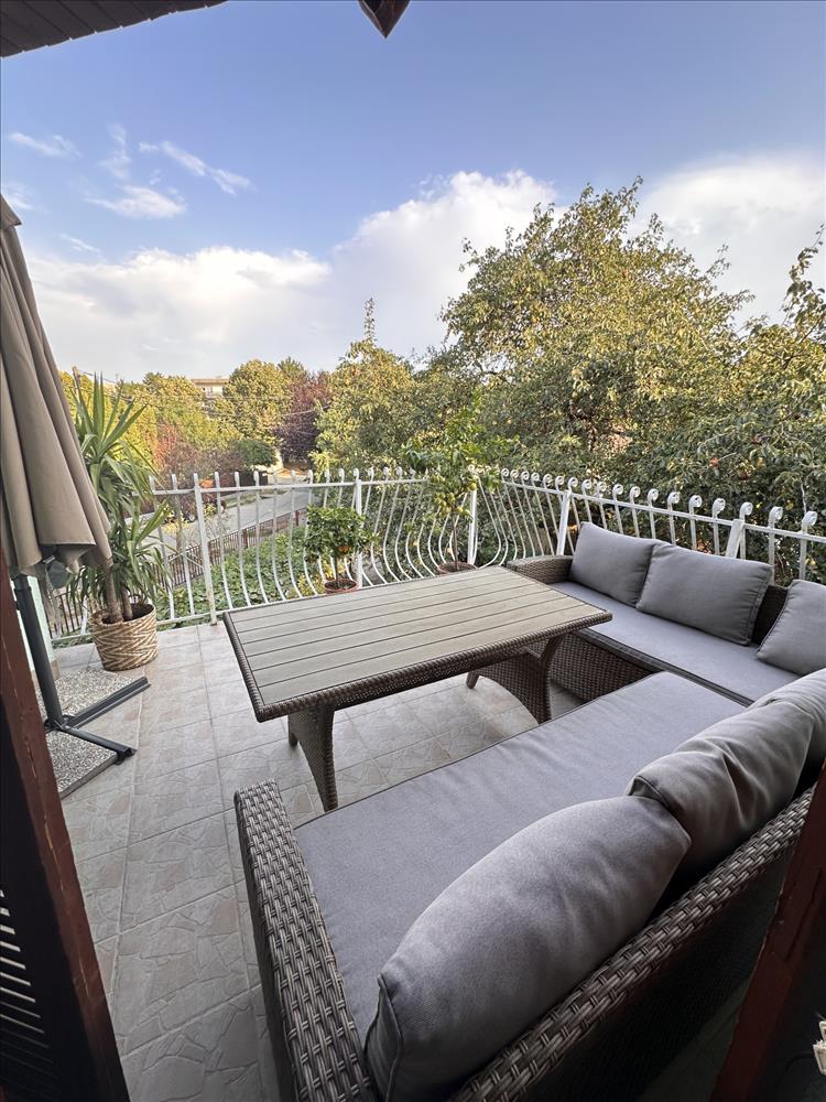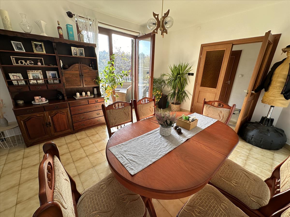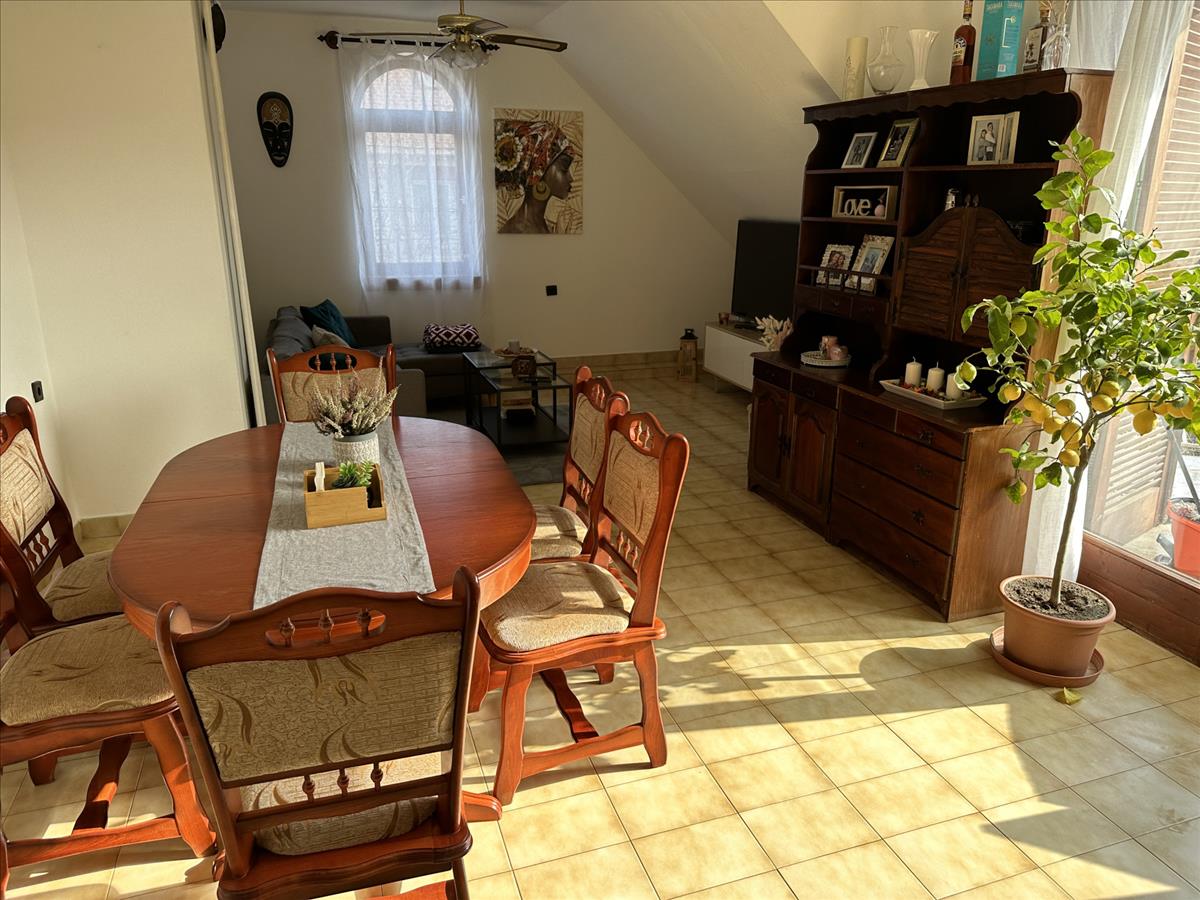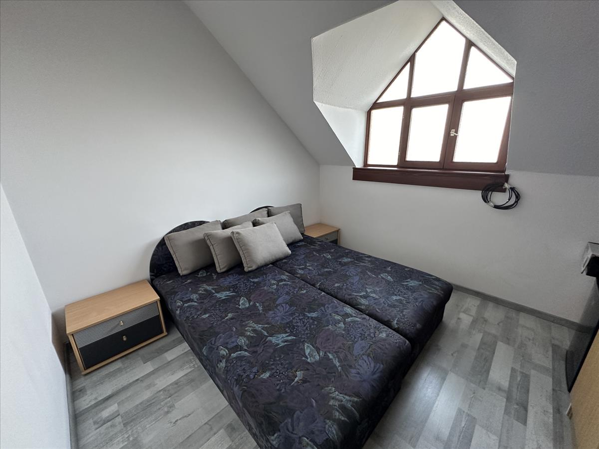 Az emeleti lakrész külön, külső fedett lépcsőházon keresztül közelíthető meg. Ezen a szinten idén részleges felújítás történt: a szobák laminált parkettát kaptak, új konyhabútor került beépítésre, valamint az ingatlant kifestették. Az emeleten 3 szoba, 2 fürdőszoba, főzőfülke és egy tágas nappali-étkező található, ahonnan egy kb. 10 M²-es fedett teraszra léphetünk ki.