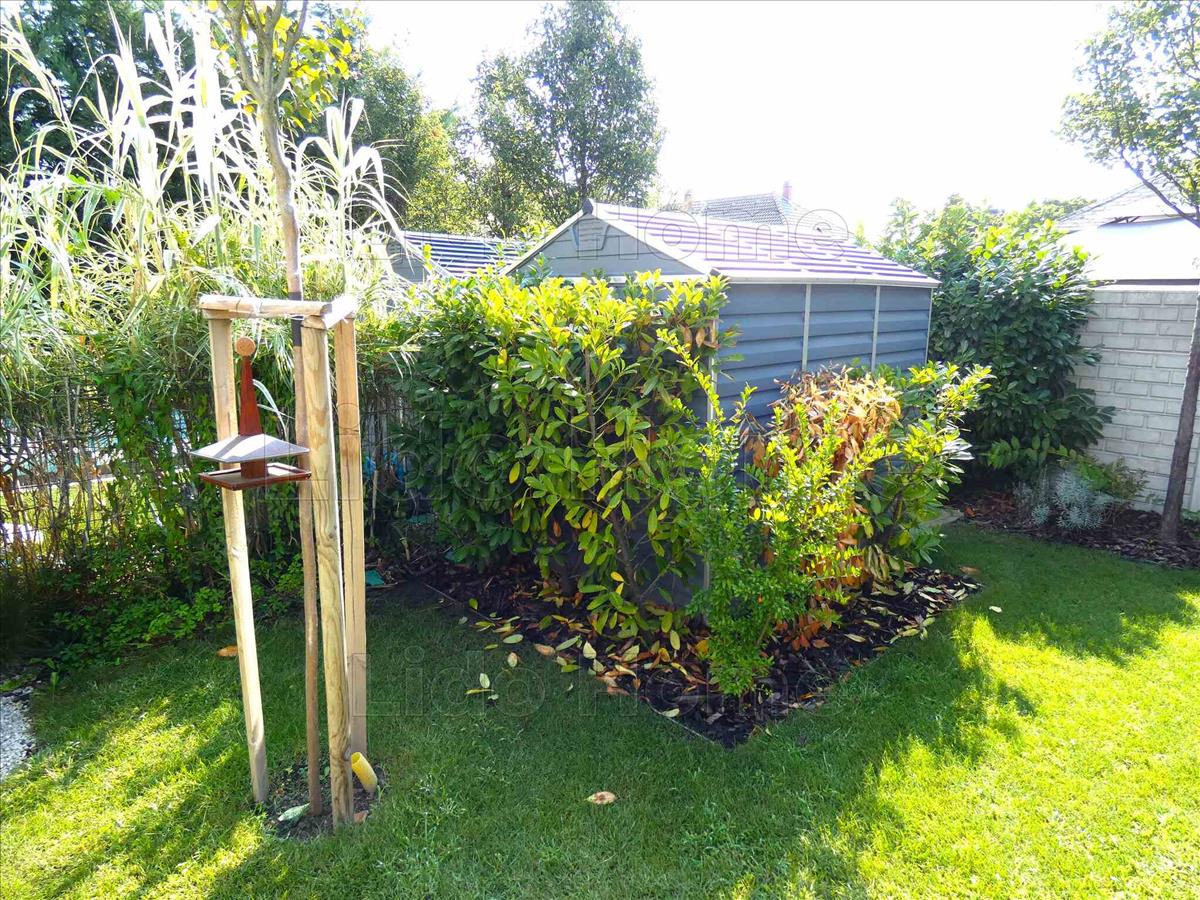 - szépen rendezett kert öntöző rendszerrel, kerti tároló polcrendszerrel,