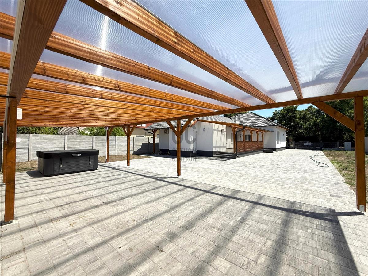 A térkőburkolattal díszített tágas udvaron helyet kapott egy jakuzzi és három autó tárolására alkalmas fedett gépkocsibeálló is.