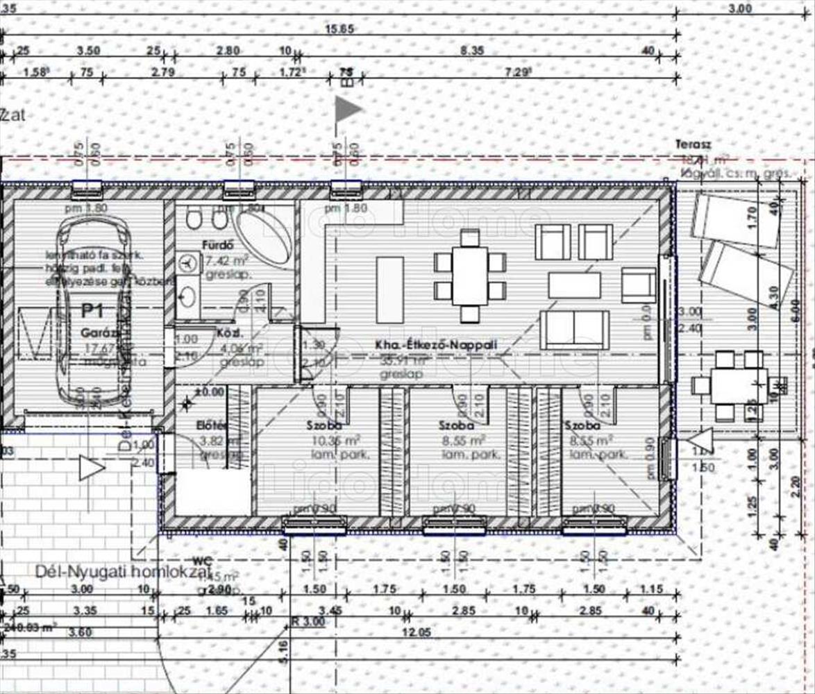 Nappali + konyha + étkező: 36 m²; 3 db hálószoba: 8, 5 m² – 10, 5 m²; Előtér/közlekedő: 9 m²; Fürdőszoba + wc: 7, 5 m²; Garázs: 18 m²; Terasz: 18 m²