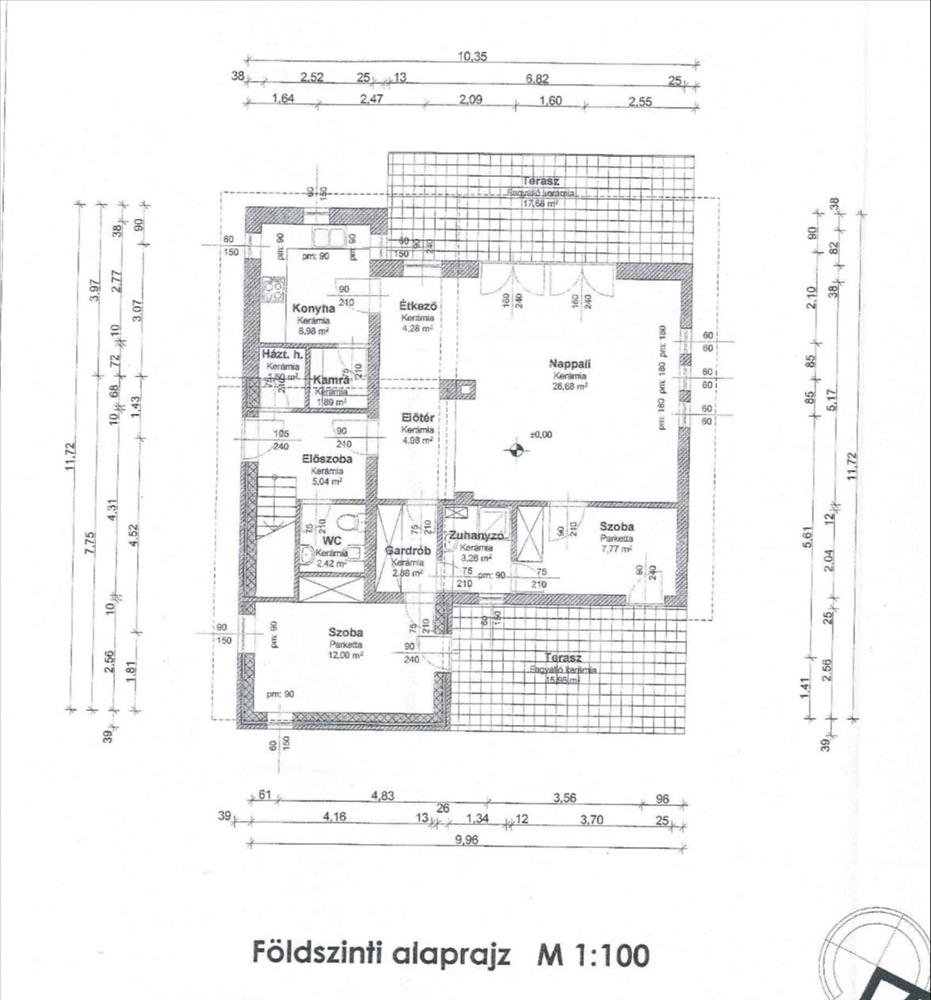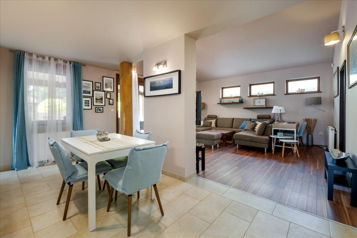 Az elrendezése rendkívül praktikus és élhető: a földszinten tágas nappali teraszkapcsolattal, étkező, szeparált konyha, kamra, valamint két hálószoba, gardrób, fürdőszoba és külön wc kapott helyet.