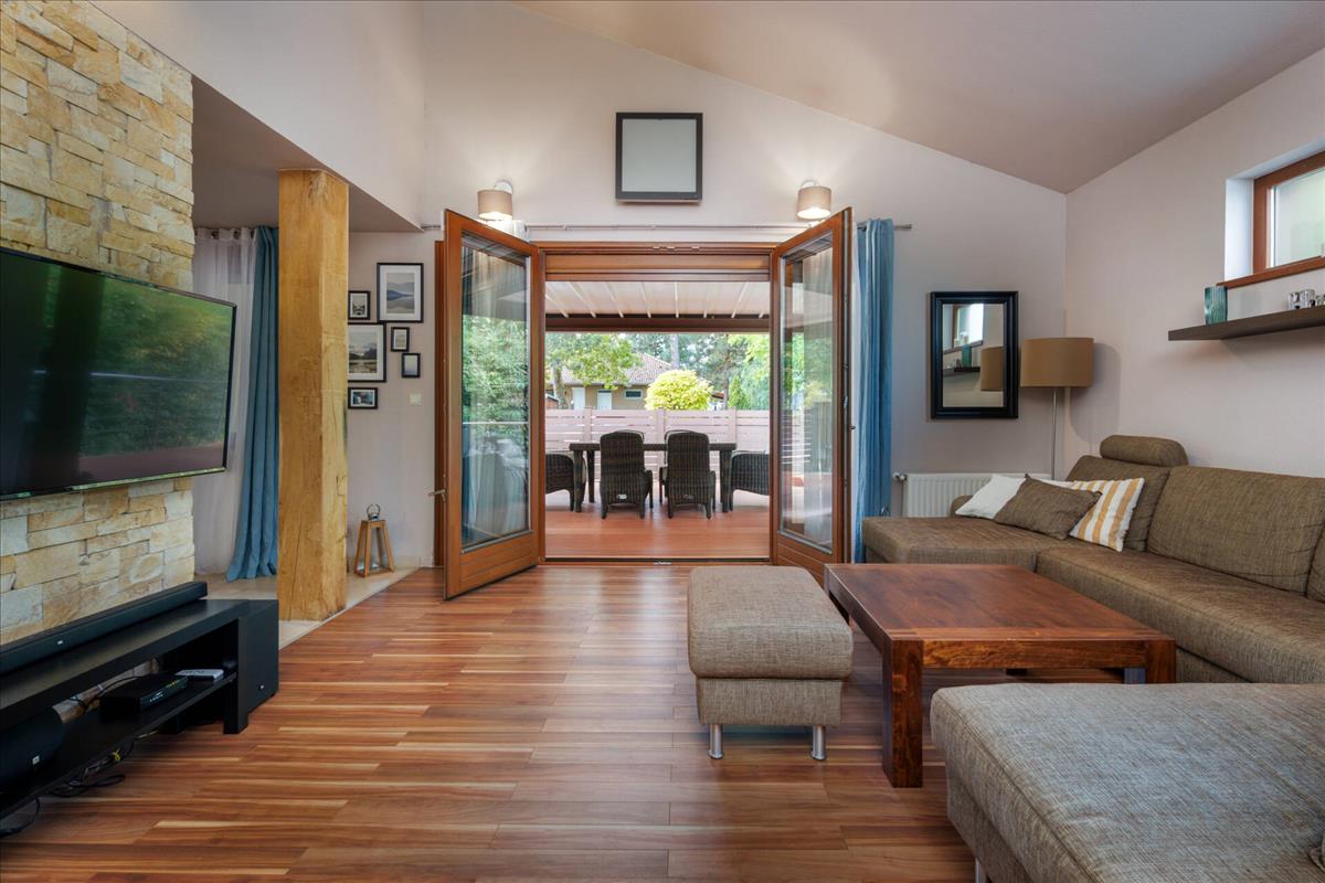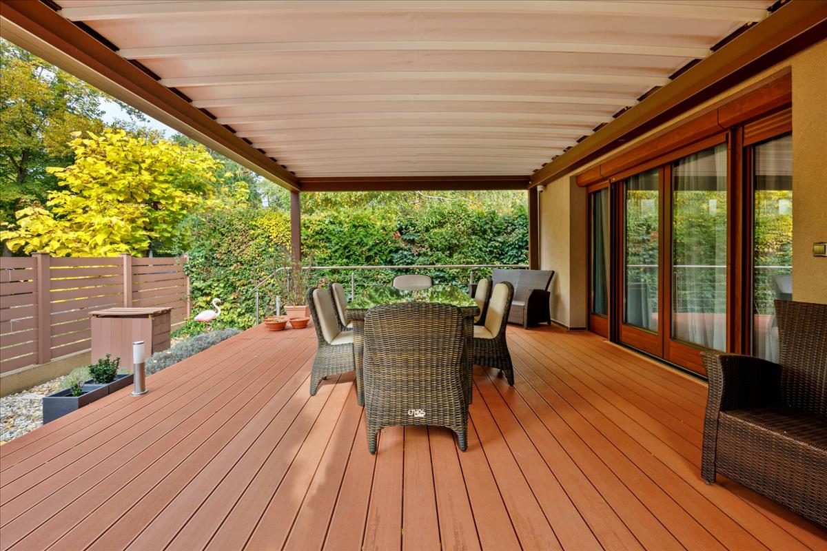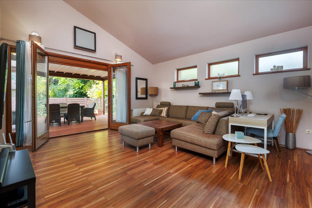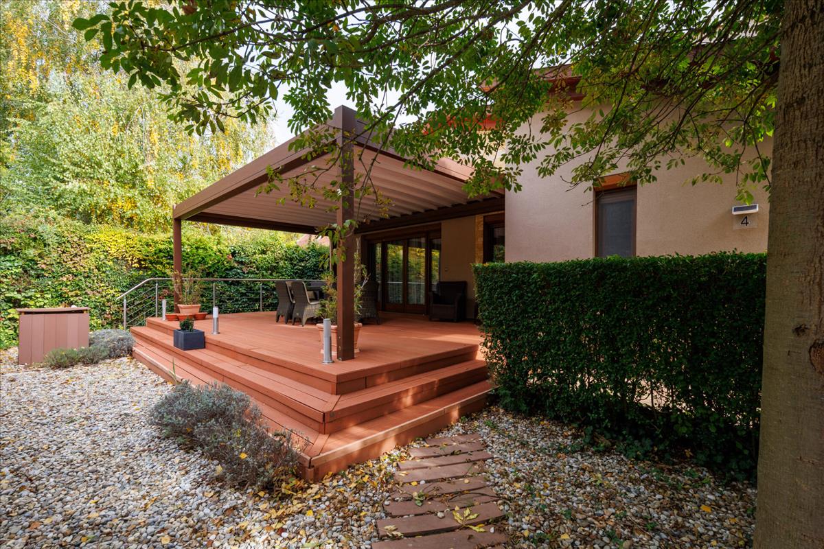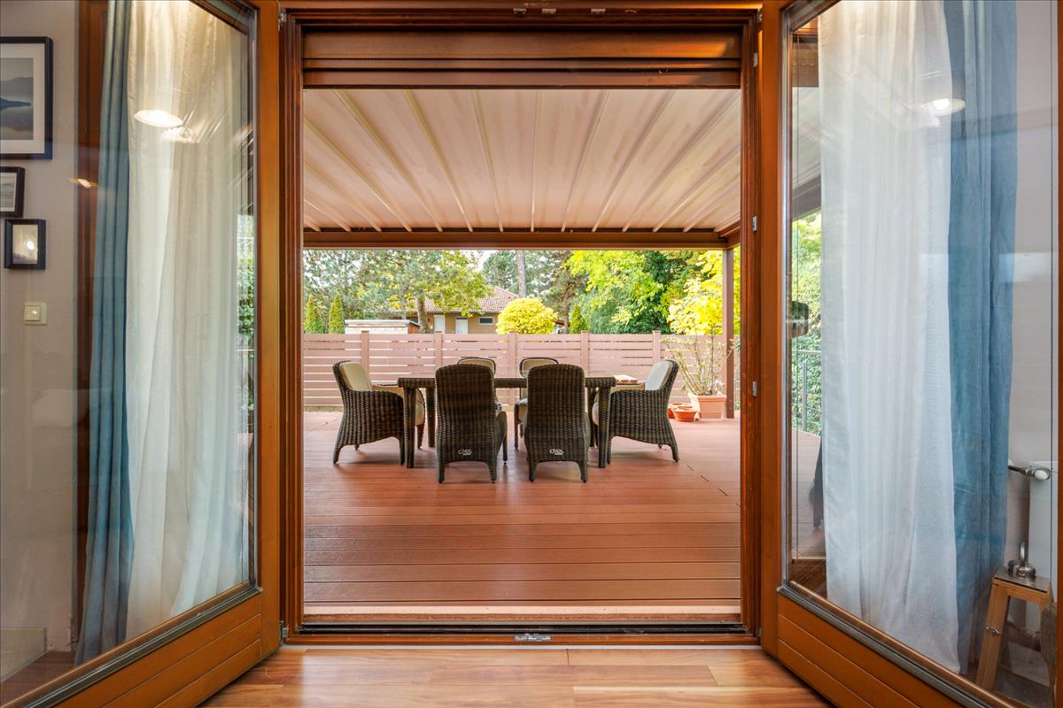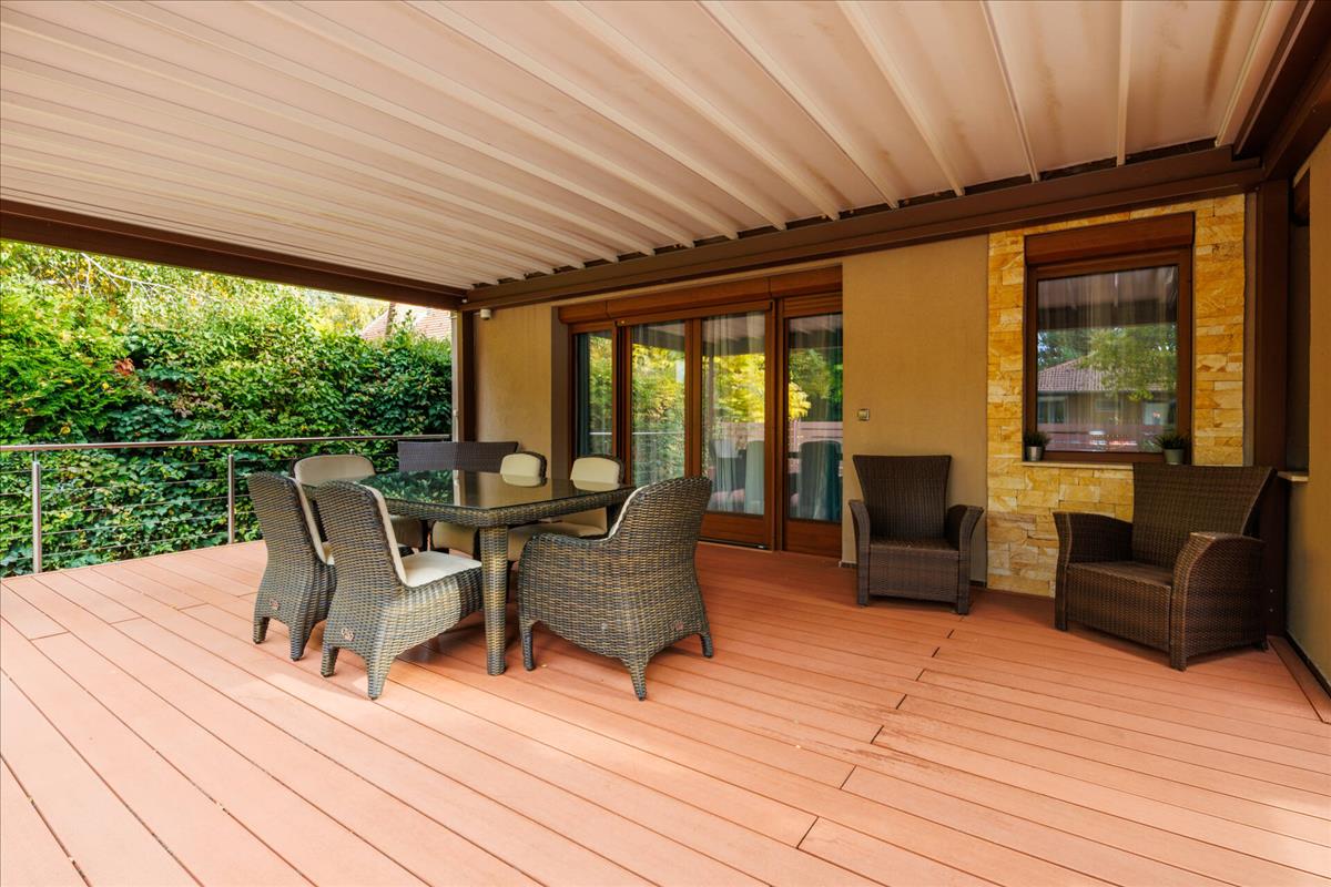 A 40 m2-es, nyitható tetejű terasz a kert szerves része-tavasztól őszig ideális helye a reggeli kávéknak, családi ebédeknek vagy esti borozásoknak.