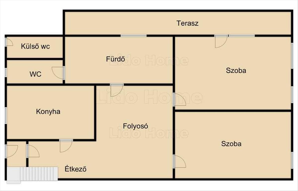 A földszinten található: konyha, étkező, egy szoba, nappali illetve fürdőszoba wc-vel.