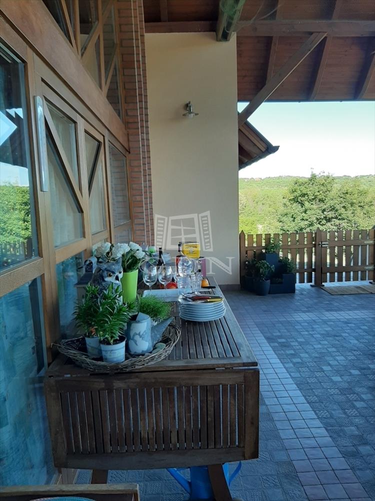 Az épület nappalijából nyíló hatalmas erkélyről a természet színes világában és a halastó csillogó vízfelületében gyönyörködhetünk.