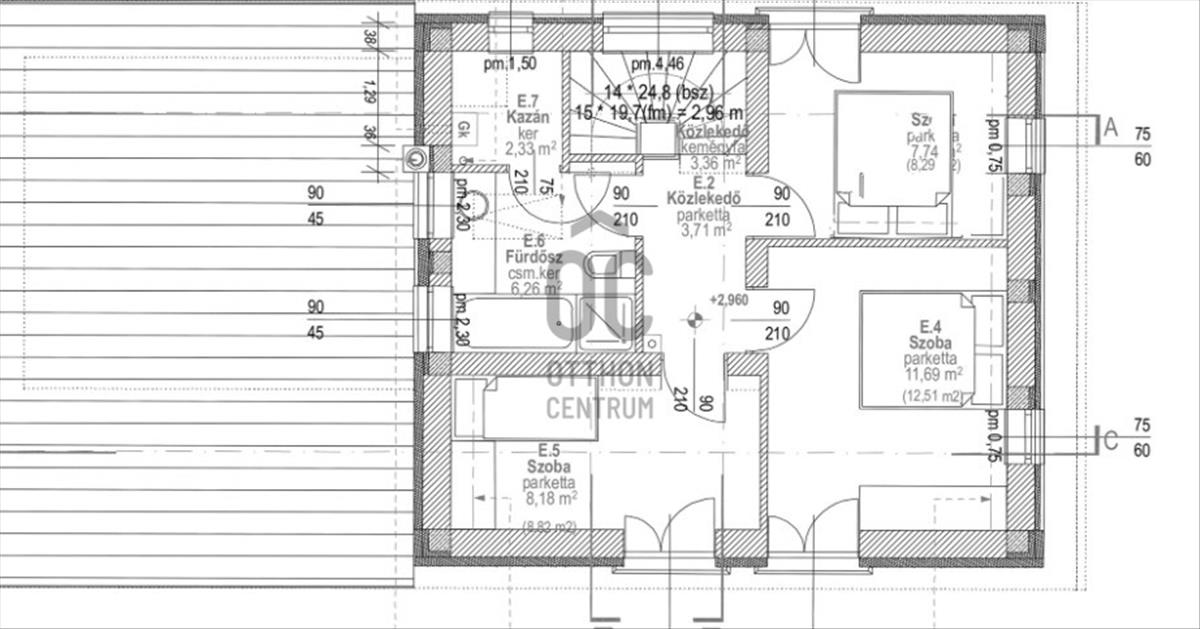 Az emeleten három hálószoba, fürdőszoba WC-vel, közlekedő és a kazánház kapott helyet.