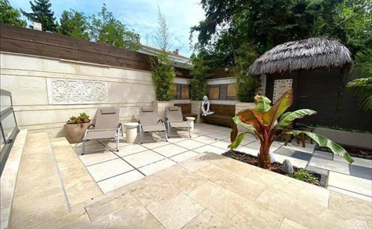 Az udvarban fűthető, fedett medence, valamint fedett jakuzzi, a medencetérhez kapcsolódó földszinti épületrészben pedig infra-, finn szauna található.