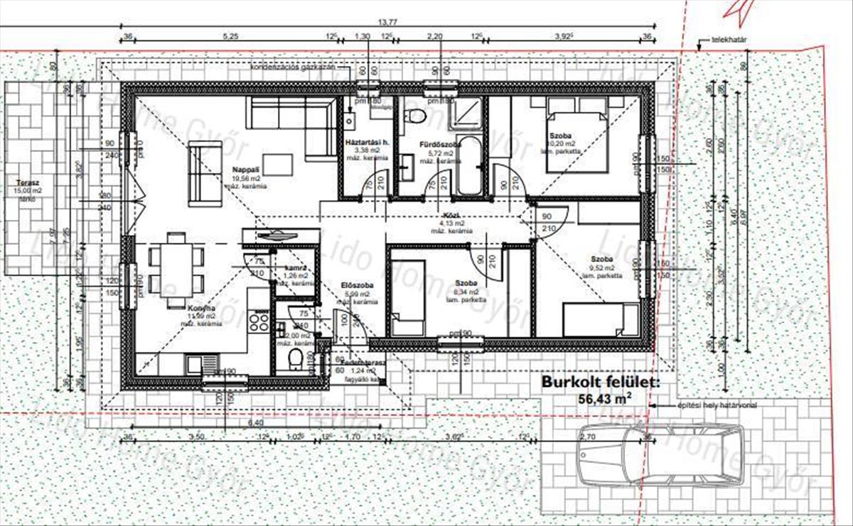 Elosztása: amerikai konyhás nappali+3 hálószoba + kamra + háztartási helyiség.