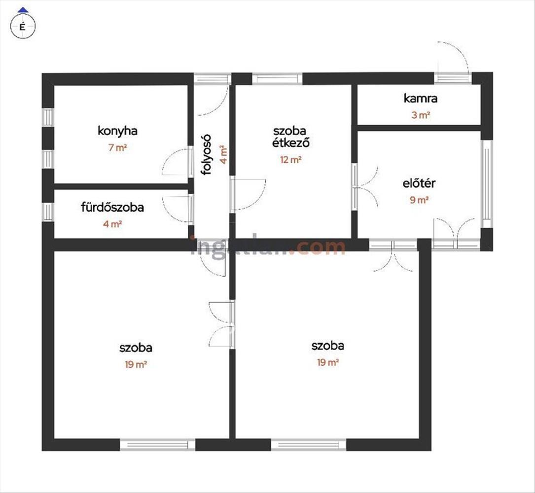 A Kádár-kocka jellegű ház elrendezése praktikus és jól átgondolt: a tágas előtérből két és fél szoba nyílik, melyek körbejárható módon kapcsolódnak egymáshoz. a félszoba jelenleg étkezőként funkcionál. a hátsó folyosóról közvetlen kijárat nyílik az udvarra. Innen közelíthető meg a konyha, a fürdőszoba és a külön wc is. a melegvíz-ellátásról gázbojler gondoskodik.