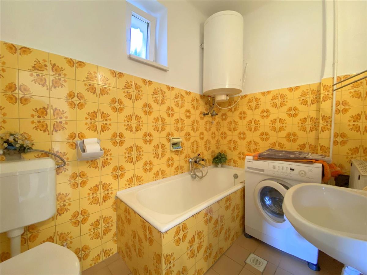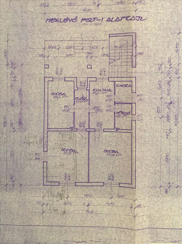 1. Földszinti lakás: 80m2-es, két egymásba nyíló nagy szobával és a folyósóról elérhető hálószobával rendelkezik, továbbá egy étkezős konyha, kamra és egy fürdőszoba található.