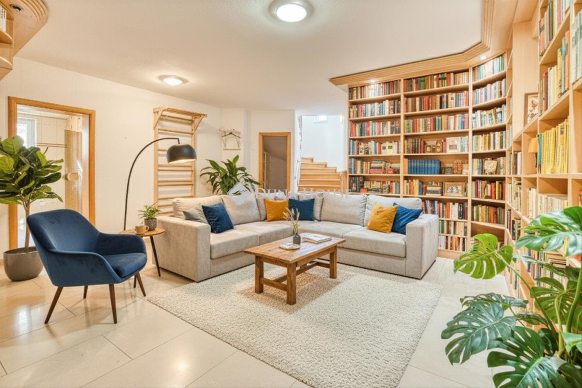 Alagsor igazi szabadidős zóna: itt kapott helyet a 5 személyes finn szauna, a két beállásos, műgyanta padlós garázs, valamint egy tágas, 60 m²-es tér könyvtárnak, mozi- vagy játszószobának.