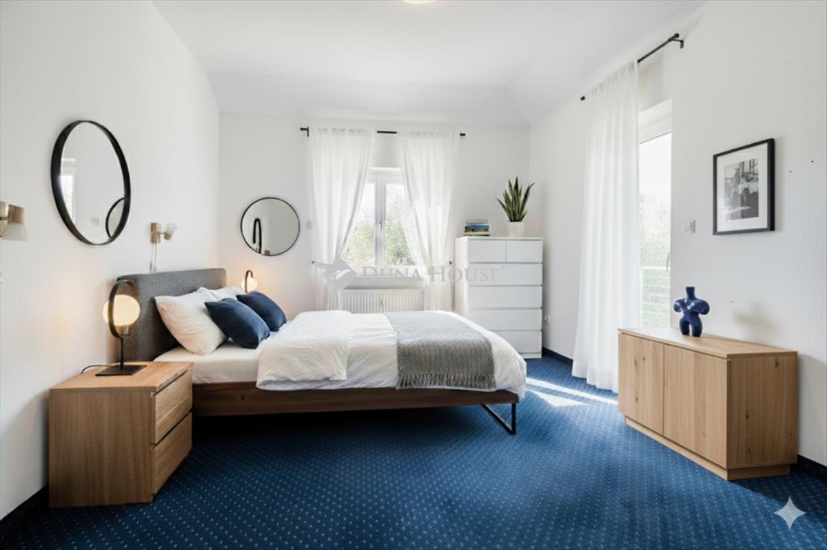 Emeleten három világos hálószoba osztozik egy modern, két terasszal kiegészített fürdőszobán. Innen nyílik a Pilisi Medencére néző örök panoráma. a hálószobákban légkondicionálás és új, szállodai minőségű padlószőnyeg biztosítja a kényelmet.