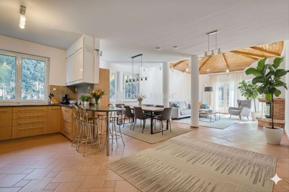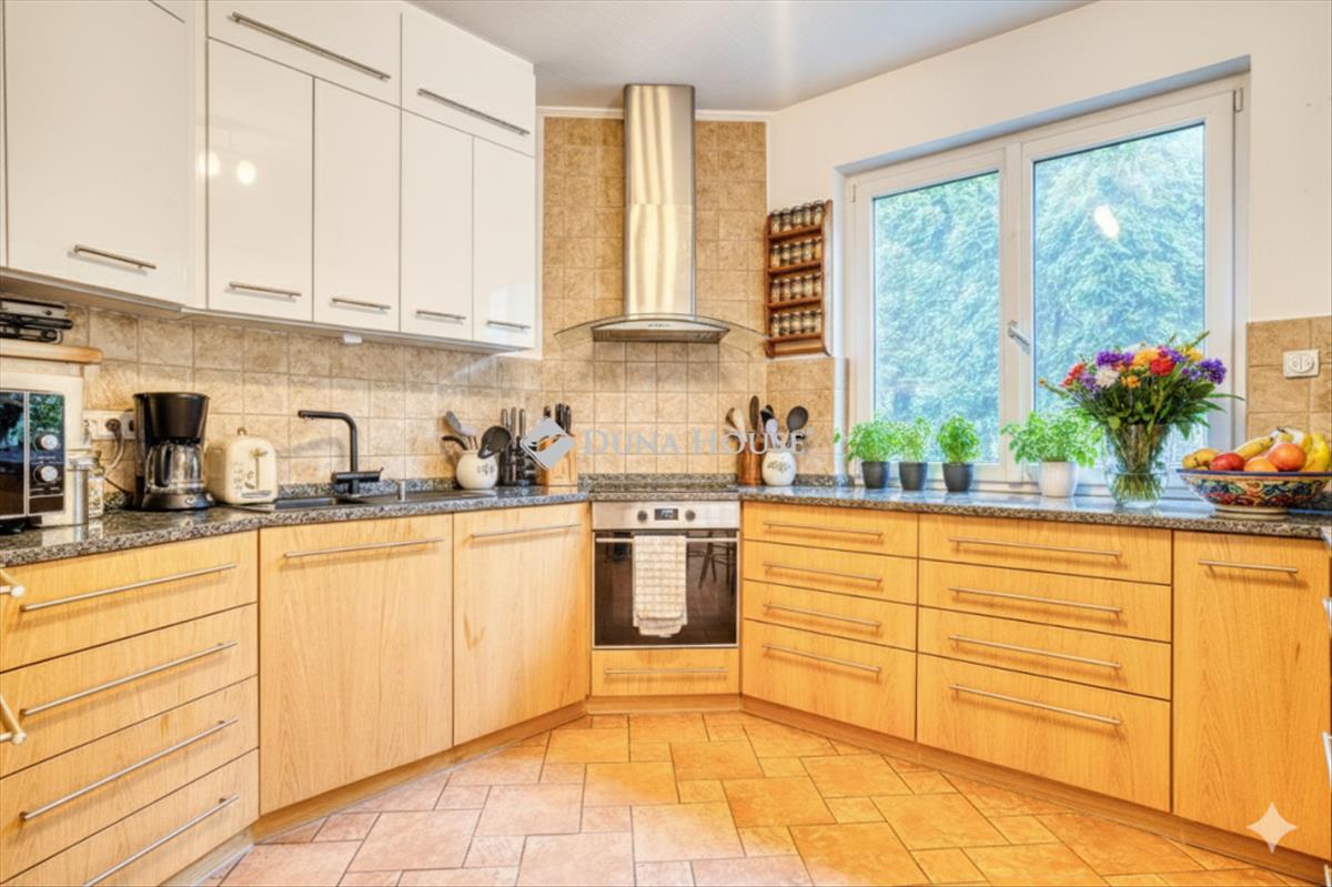 Földszint központi eleme a 80 m²-es nappali-konyha-étkező, melyet óriás ablakok nyitnak a kertre. a modern, gránitpultos Teka konyha és a fatüzelésű, hőkifúvásos kandalló teremtik meg a családias hangulatot. Ezen a szinten található a kertkapcsolatos, saját gardróbos és dupla mosdós fürdővel ellátott szülői lakosztály.