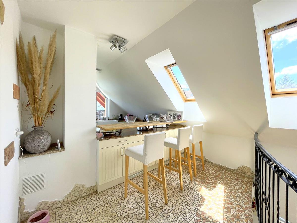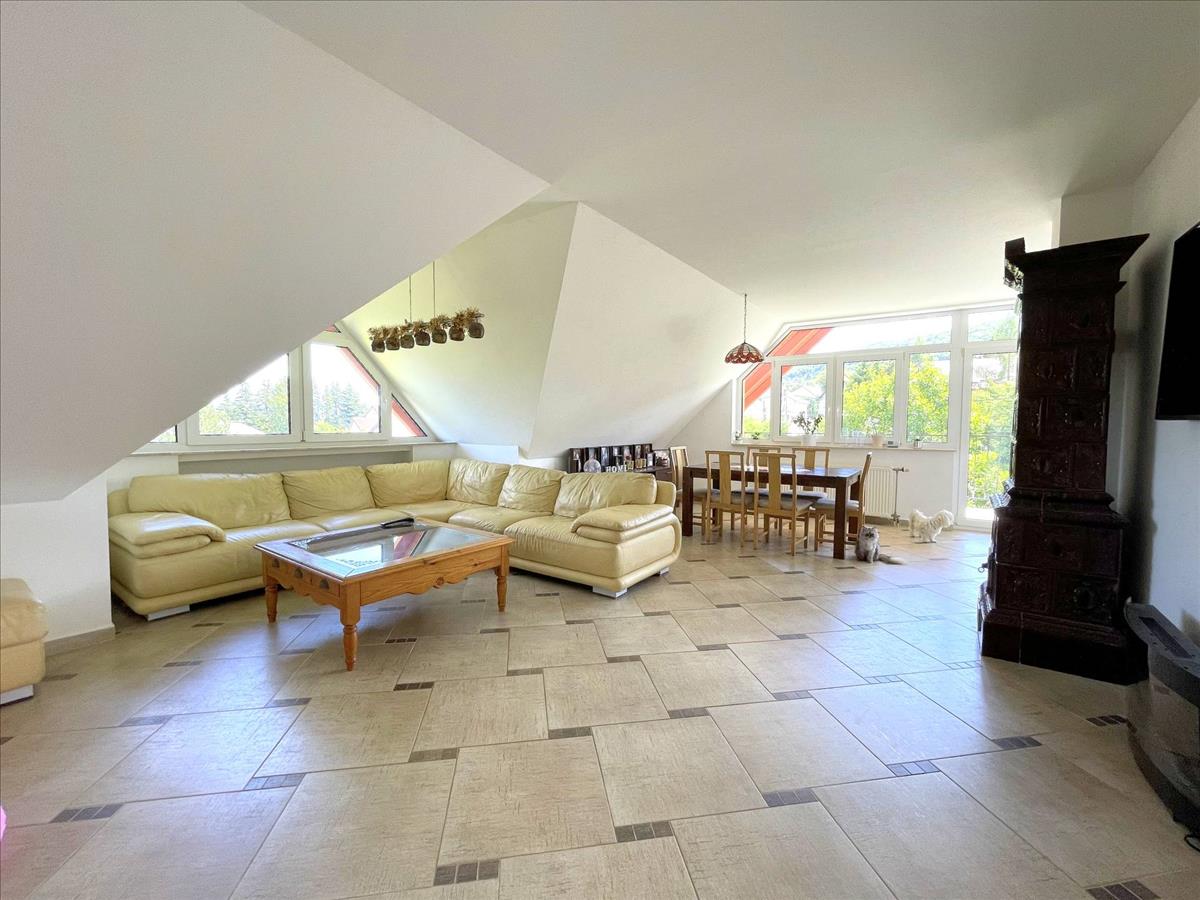 Az emelten: egy igazán pazar, hatalmas, csupa fény, erkély kapcsolatos amerikai konyha- nappalit találunk egy egészen különleges, látványnak sem utolsó cserépkályhával. Ezen a szinten van még egy tágas hálószoba fürdőszoba kapcsolattal, gardrób, külön mellékhelység kézmosóval.