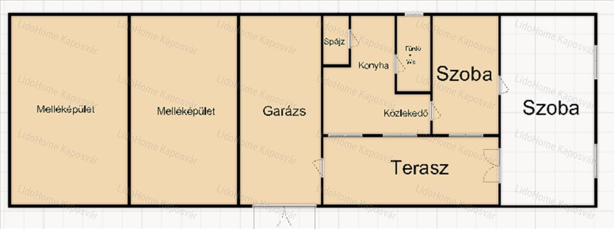 1 Nagyobb méretű szoba, 1 normál méretű szoba, konyha, spájz, fürdőszoba, közlekedő, terasz.