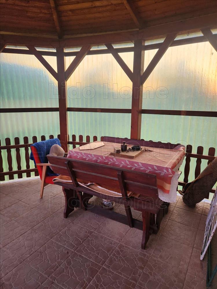 A házhoz egy kellemes méretű, fedett terasz kapcsolódik, amely ideális helyszíne lehet a reggeli kávézásnak, családi ebédeknek vagy baráti beszélgetéseknek. a terasz a kertre néz, így nyugodt, zöld környezetben pihenhetünk.