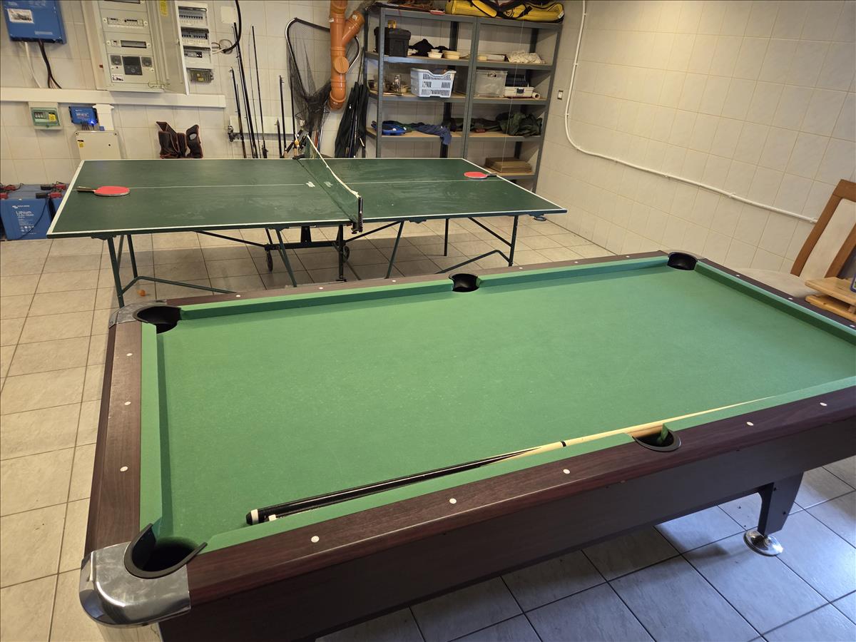Az épület elosztása: konyha, nappali, étkező, kamra, 3 szoba, 2 fürdőszoba, garázs, egy kis növényház valamint szabadidőterem (pingpong és biliárdasztal)