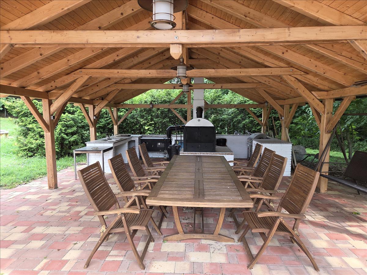 A ház mellett van egy fedett nyári terasz kemencével, sütögetővel.