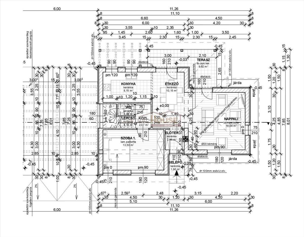 - Földszint 56, 5 m2 : - nappali, étkező, konyha, szoba, wc, előtér + 10 m2 terasz