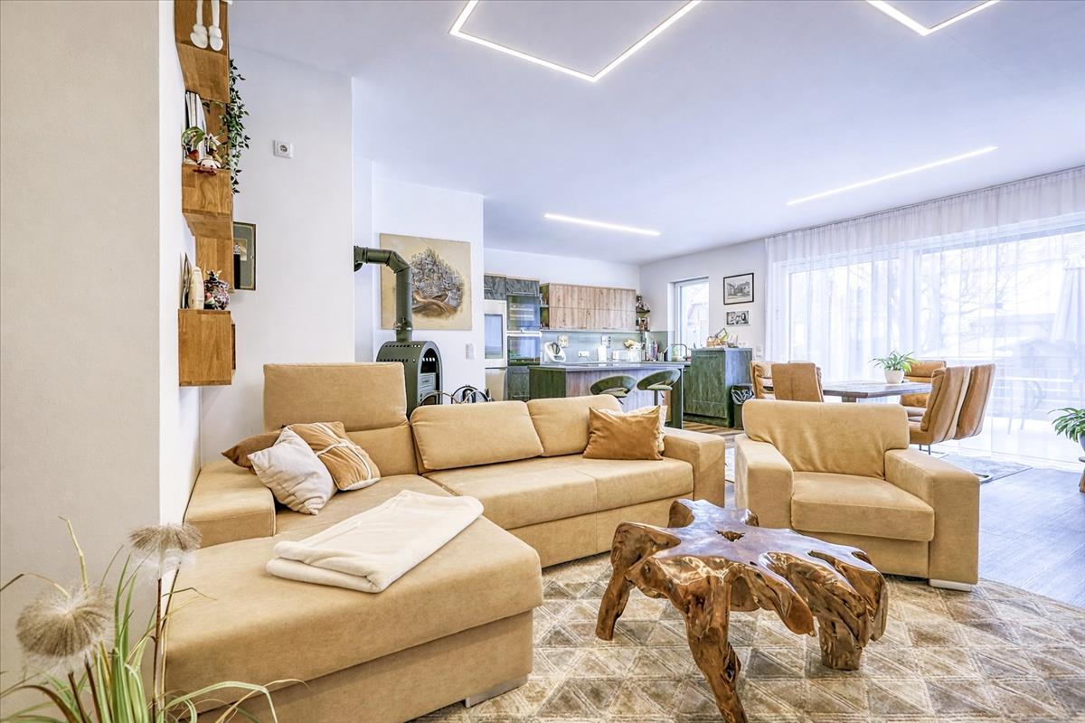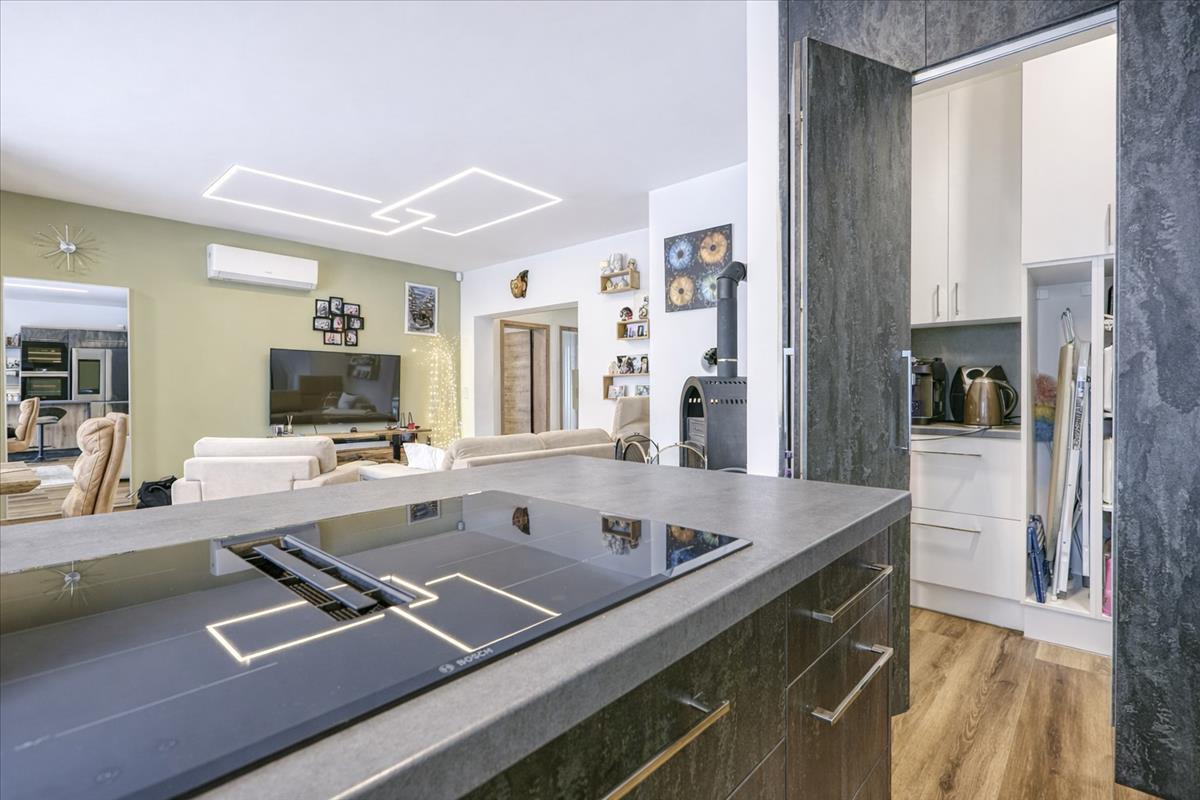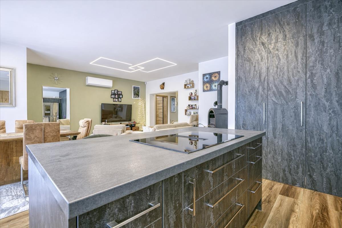 A belső atmoszférát tovább emeli a működő kandalló hangulata és a mindkét szinten kiépített padlófűtés, ami az otthon egészét melegen, egyenletesen és gazdaságosan tartja.