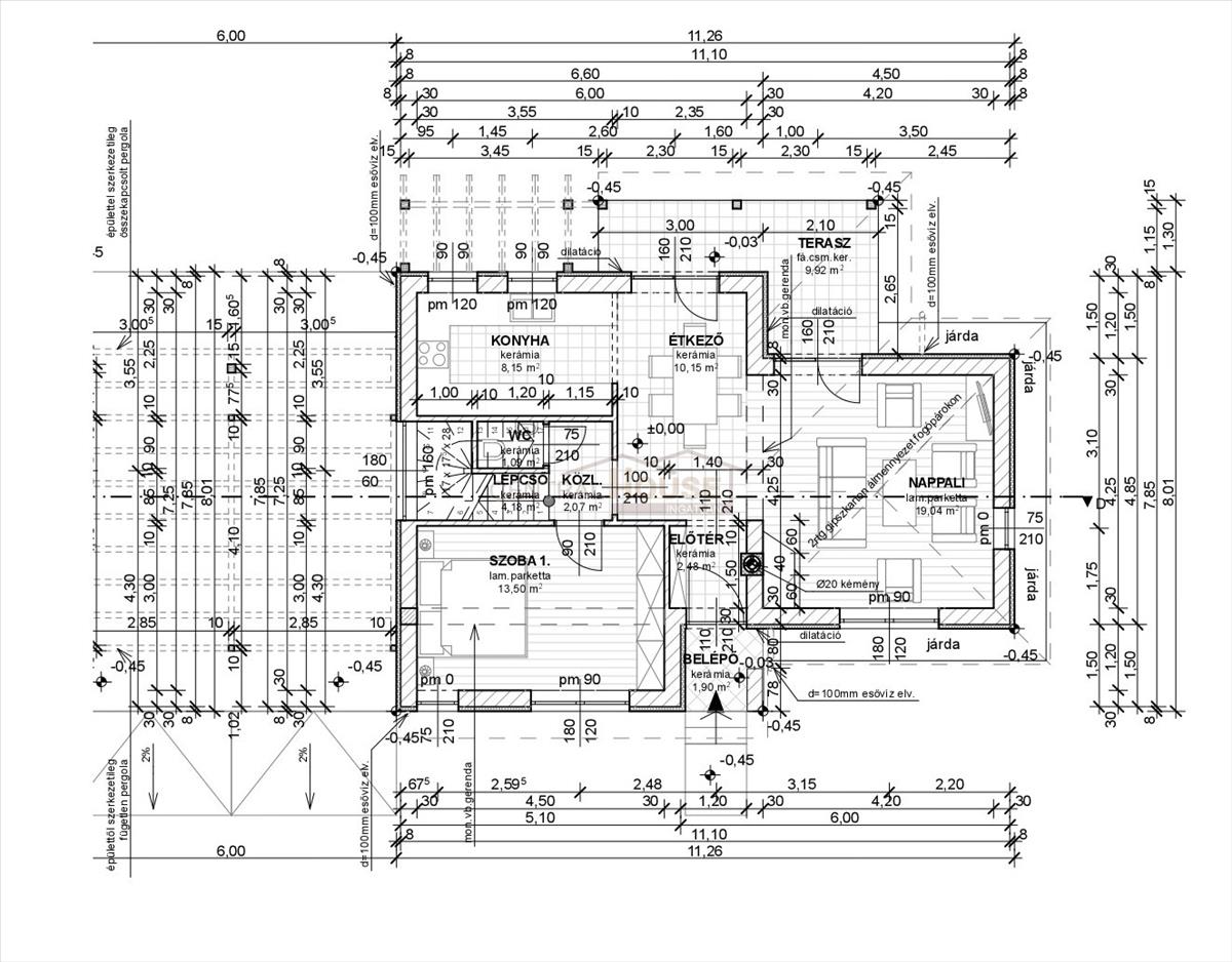 - Földszint 56, 5 m2 : - nappali, étkező, konyha, szoba, wc, előtér + 10 m2 terasz