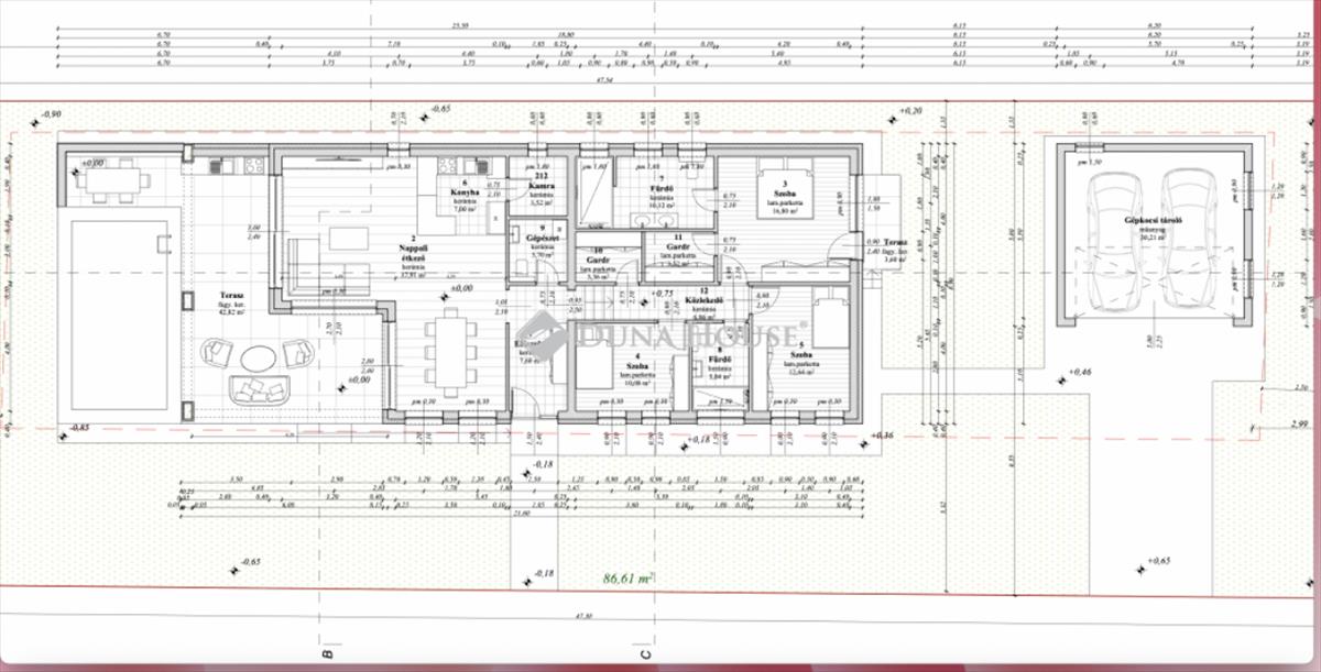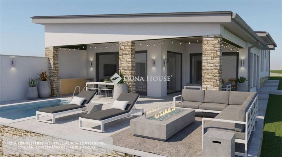 Sóskút legszebb utcájában minőségi, új otthon eladó! Medencével és önálló dupla állásos garázzsal! Csok Plusz és 3 % osp kompatibilis! Sóskúton eladó egy nettó 128, 15 m2 + 42 m2 teraszkapcsolattal egy minimál stílusú önálló családi ház. Csendes, aszfaltozott, rendezett utcában található, szép házak és erdő környezetében. a telken található egy önálló 2 állásos tégla építésű garázs is, mely 30 m2-es. Ház körül és a terasz térkövezve. Telekterület összesen 738 m2. Elosztását tekintve:- Tágas és napfényes amerikai konyhás nappali, 42 m2-es hangulatos terasz és medence kapcsolattal. a medence 8x 3, 5 méteres. Fedett terasz részen pedig épített sütögető rész. - Kamra- 3 jó méretű szoba- 16, 80 m2-es Master bedroom saját 10 m2-es fürdővel és gardrób helyiséggel- Fürdőszoba- Gardrób - Háztartási helyiség gépészettelMűszaki adatok:- 30 cm Porotherm tégla falazat, 10 cm tégla válaszfalak- 15 cm homlokzati szigetelés- 8 KW-os Hőszivattyú fűtés- Minden helyiségben padlófűtés- Tetőn korcolt lemezfedés- Vasbeton födém, 30 cm szigeteléssel- 3 rétegű 5 légkamrás minőségi nyílászárók- Riasztó kiépítve- Szaniterek- Hideg/meleg burkolatok 8000 Ft/m2- Beltéri ajtók / 100 000 Ft /db/ - 5 ponton záródó bejárati ajtó Az építkezés szerkezetkész állapotnál tart így már besétálhat és elképzelheti leendő otthonát. Megtekintés után minden a házzal kapcsolatos dokumentáció rendelkezésre áll. EXTRÁK:- Térkövezés a házzal megegyező színvilággal- Minden nyílászáron elektromos vezérlésű redőnyök egyedi színben- 1 db klíma készülékVárható átadás: 2026 Nyár. a medence és az épített garázs ára +15 000 000 Ft a vételáron felül. Iskola, óvoda, bevásárlási lehetőségek, m7 autópálya perceken belül elérhetőek. További információkért hívjon a megadott telefonszámon.