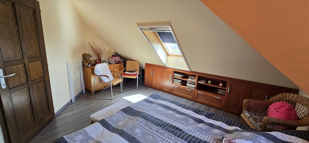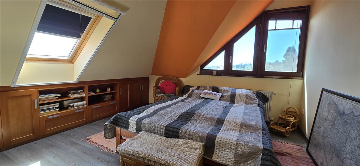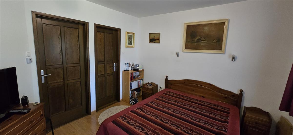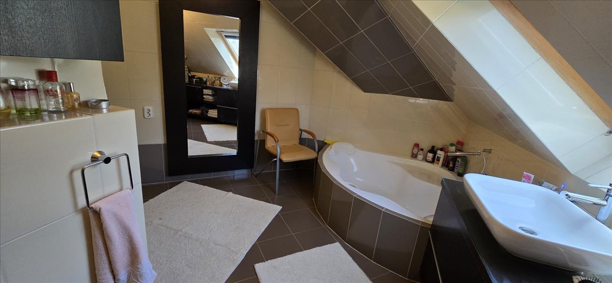 érjük el a nagyobb hálószobát, melyhez külön fürdőszoba tartozik. Az előszobából nyílik a másik hálószoba, illetve a lépcsőház, melyen át feljutunk az emeletre és lejutunk a garázsba.
