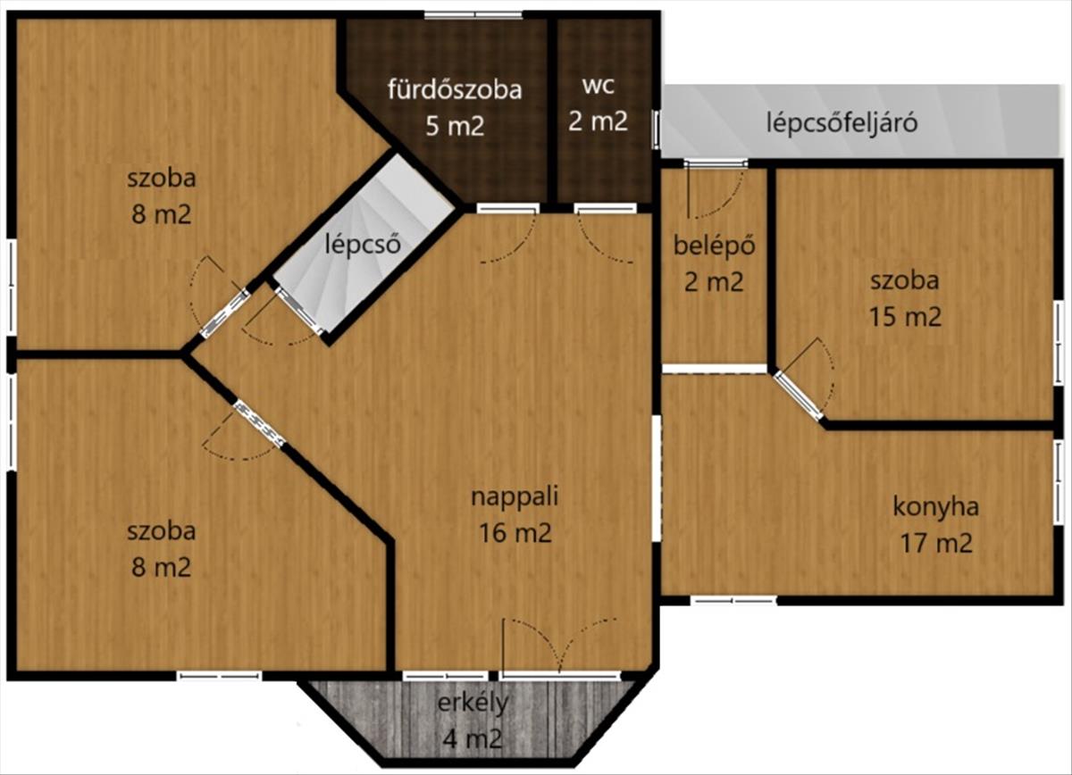 Az emelet nettó 71 m2, bruttó 119 m2, 4 m2 terasszal, nappali + 3 szoba.