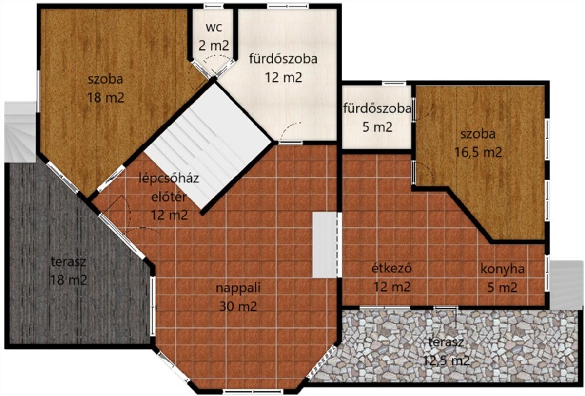 A földszint 112 m2-es, + 30 m2 terasszal, nappali + 2 szoba.