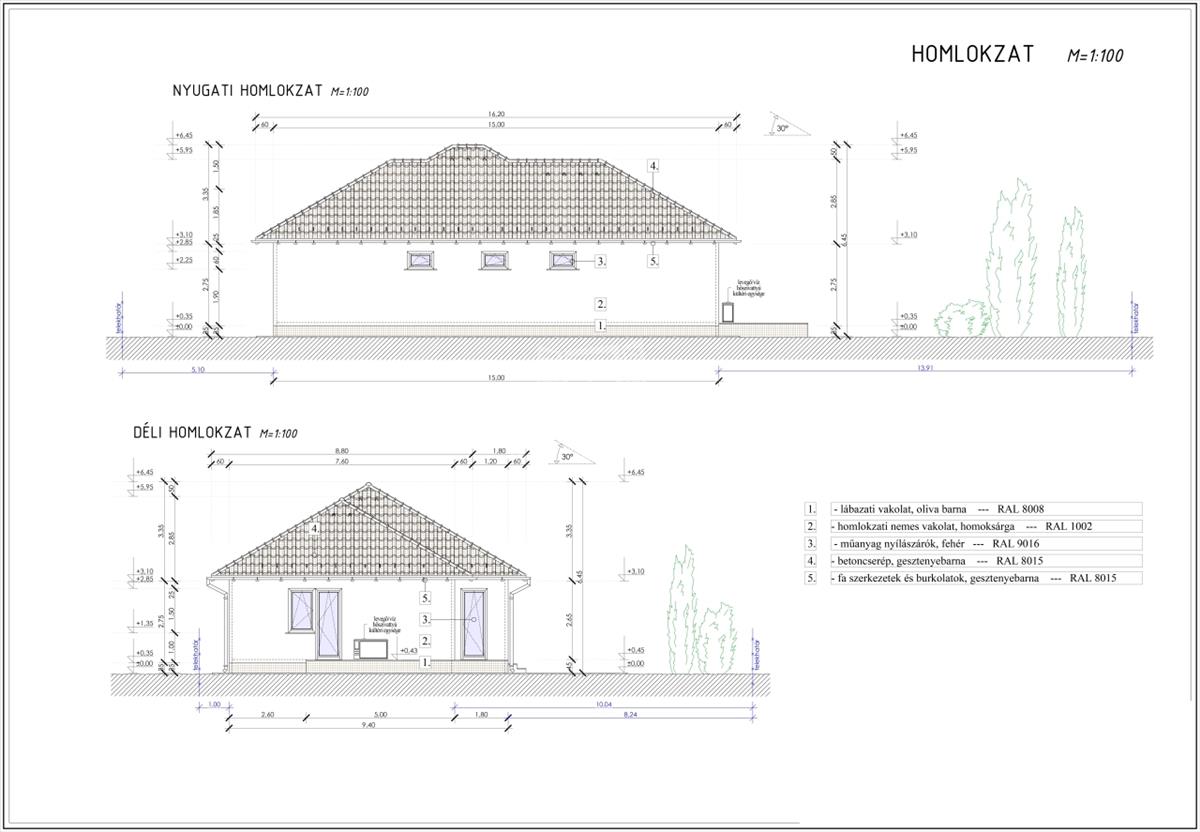 A tető héjazata antracit betoncserép lesz, a homlokzatok 15cm eps, a padló 10cm Austrotherm AT-N100-as, a vízszintes födém 25cm Ásványgyapot szigeteléssel lesz ellátva.