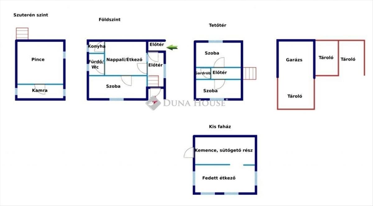 Az ingatlan 3 szintes. a szuterén szintbe egy nagy pince és egy kamra került kialakításra. a földszinten egy kis bővítéssel (beépített terasz) került kiépítésre az előszoba, melyből egy kis nappali/előtér került a téglaházhoz. Innen a nappali/étkező helyiségbe érünk, ahonnan egy nagy szoba, kis konyha és egy fürdő/mosdó helyiséget alakítottak ki a tulajdonosok. Az emeletre az előszobán keresztül jutunk fel, ahol egy előtérből 2 külön nyíló szoba és egy gardróbszoba került kialakításra.