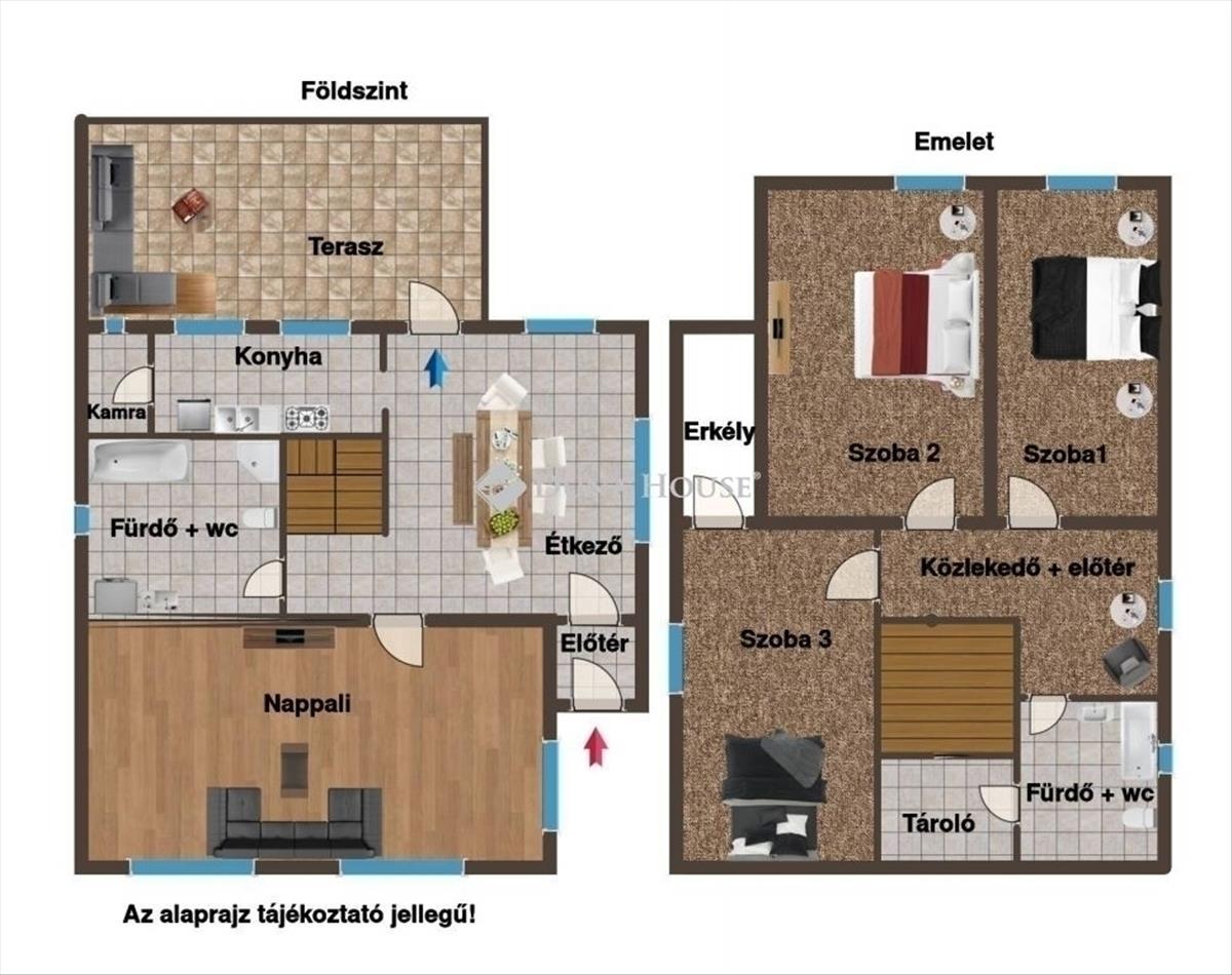 Az emeleten előtér, három külön bejáratú szoba (az egyik erkélyes), továbbá egy fürdőszoba és egy gardrób került kialakításra.