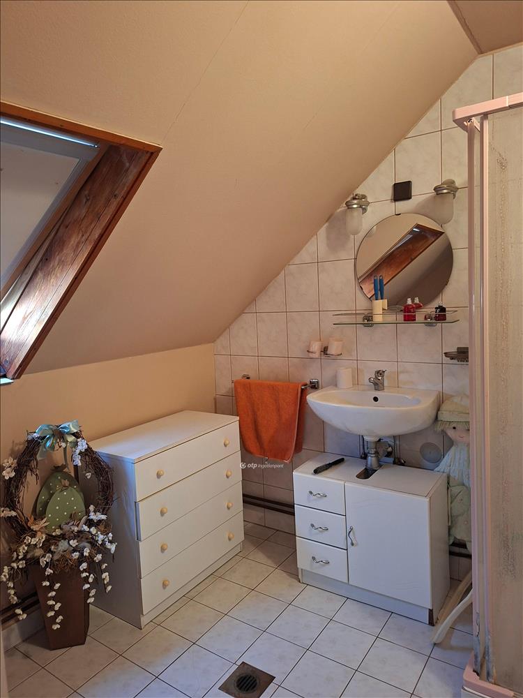 Az emeleti részen kettő félszoba, közlekedő és fürdőszoba-wc helyiségek helyezkednek el.